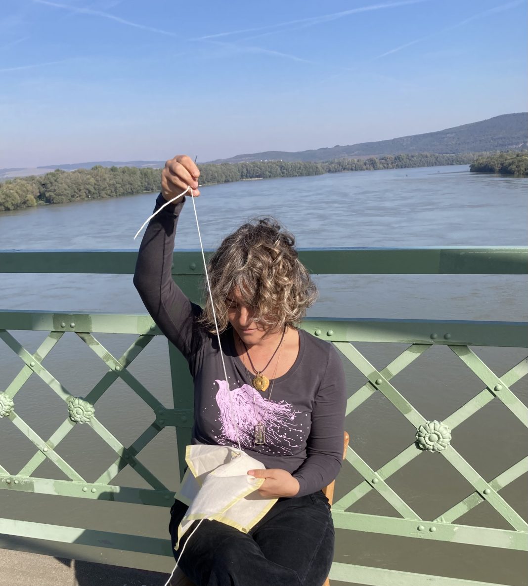 Un’installazione composta da un telo bianco ricamato, un diario, un video e un’azione performativa che documentano il lavoro artistico svolto da Maria Chiara Calvani sul Ponte sul Danubio “Maria Valeria” che collega i territori dell’Ungheria e della Slovacchia.
