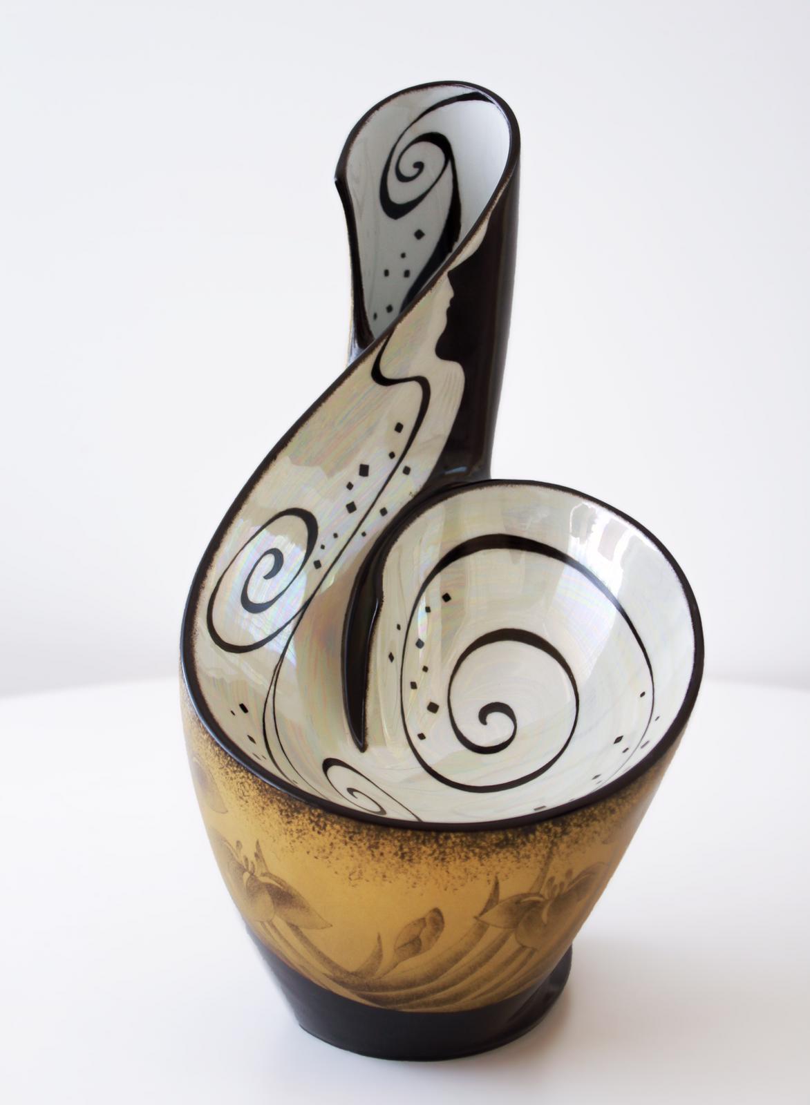 Un’arte antica, delicata, di alta artigianalità che ha portato l’artista a scegliere di decorare la porcellana con “polvere d’oro antico giapponese”, che ne caratterizza tutta la sua produzione, tanto da definirla unica nel suo genere. Oro antico su fondo bianco o su fondo nero che ritroviamo nelle decorazioni dei preziosi complementi di arredo, tra i quali spiccano vasi e piatti ornamentali e nella minuziose e raffinate creazione di splendidi gioielli, tra i quali spiccano gli originalissimi pendenti.