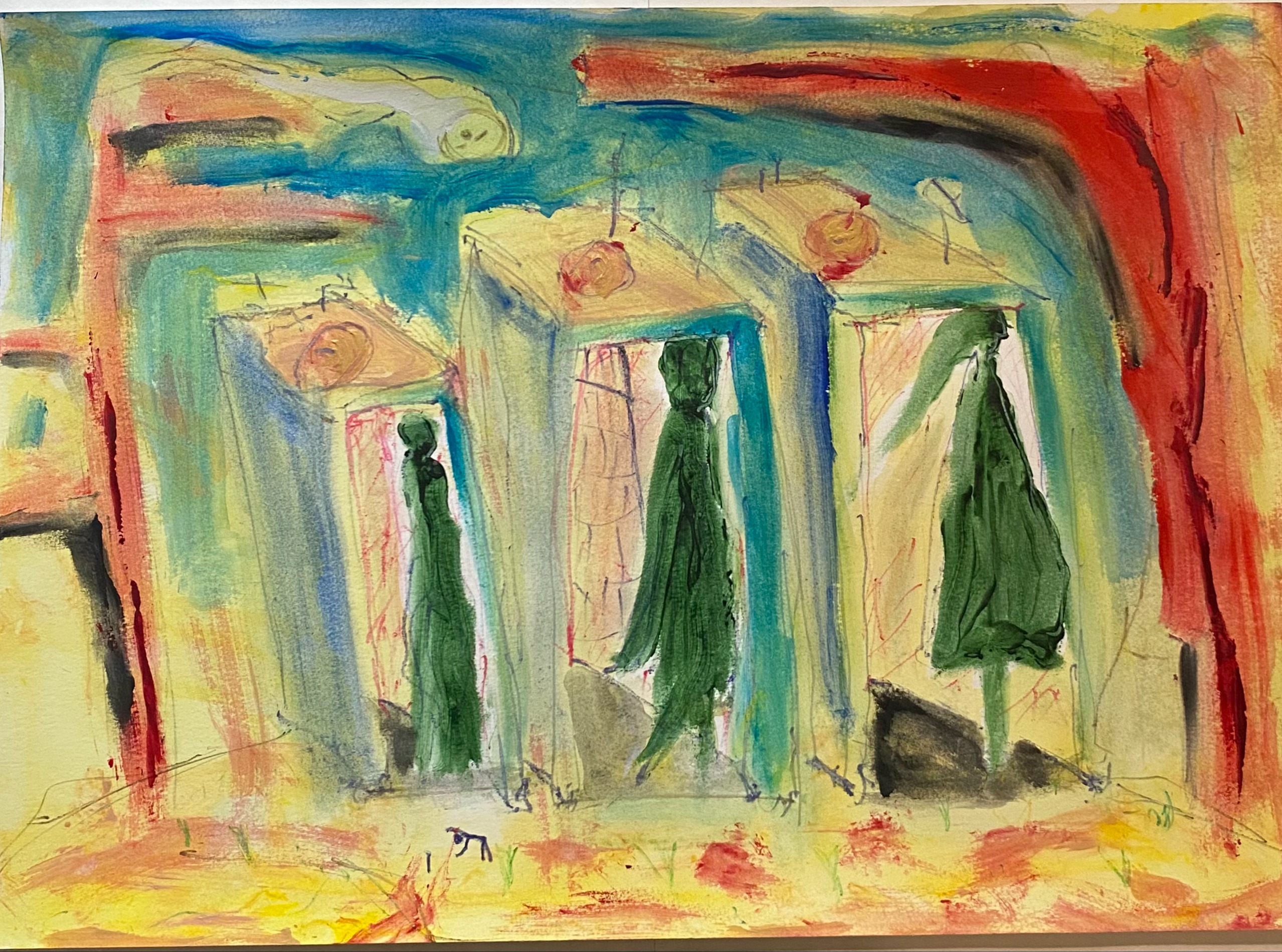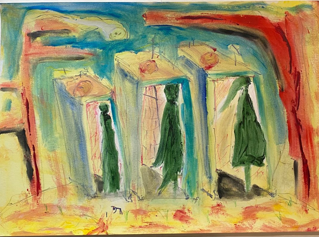 Nella prima sala, al pianoterra, accedendo attraverso un sipario, cinque menhir suggeriscono il luogo sacro, a simboleggiare un paesaggio silvestre ove si ergono verticalmente, come alberi, gli approssimativi parallelepipedi. I monumenti monolitici sono riprodotti in scala, nel “dialogo” (così lo definisce l’artista) con gli artigiani locali della cartapesta, com’è nelle sue corde. A quelle strutture verticali si accompagna la serie pittorica dei Bagnanti, rappresentazioni d’impianto espressionista entro un’atmosfera onirica.