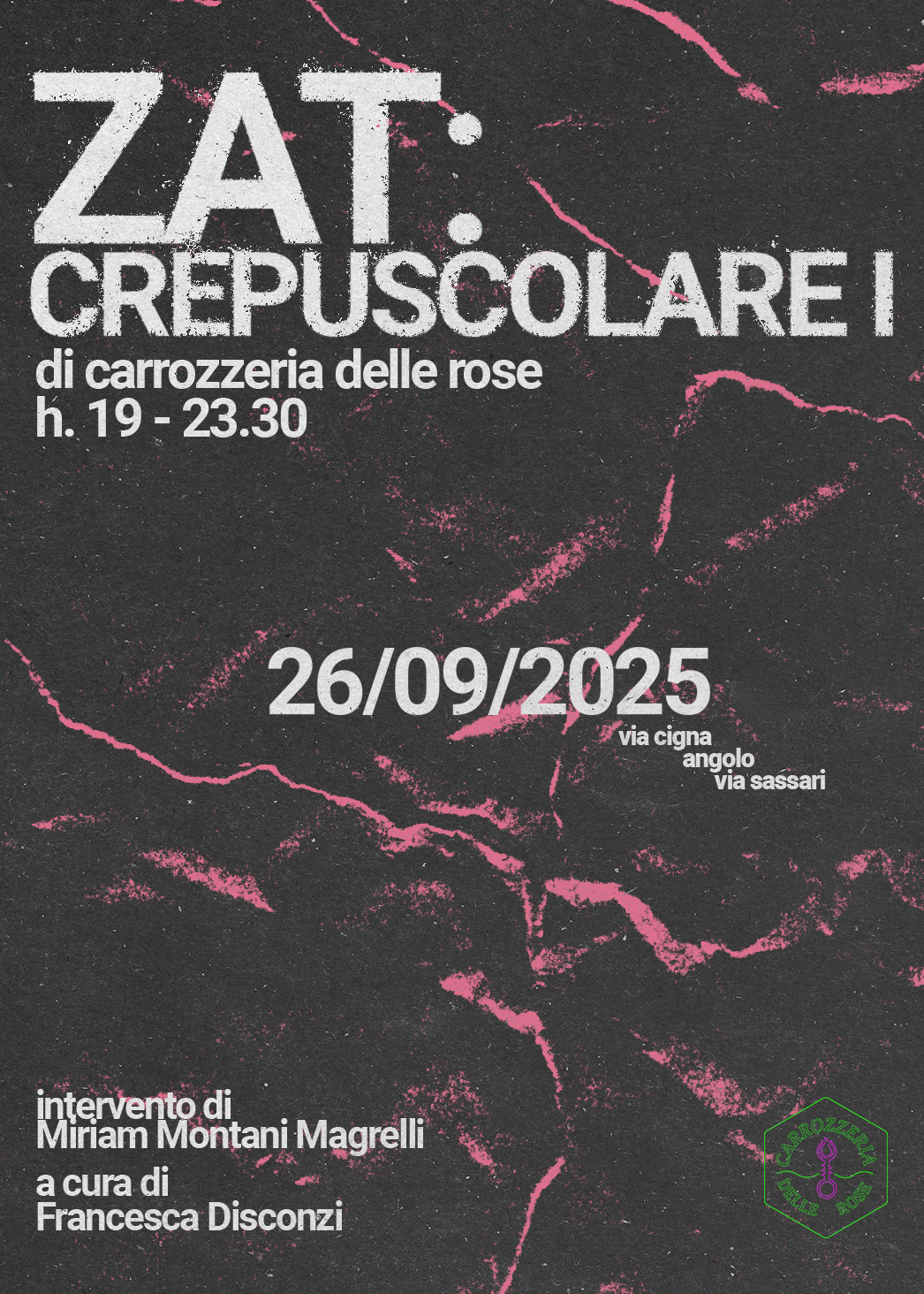 Carrozzeria delle Rose inaugura il primo evento del progetto dal titolo “ZatCrepuscolare”, ideato per la città di Torino. Progetto che al momento coinvolge l’artista Miriam Montani Magrelli (fondatrice di Carrozzeria delle Rose Milano -Torino) e la curatrice Francesca Disconzi e che, successivamente, vorrebbe coinvolgere altr3 artist3 e altr3, curatrici e curatori.