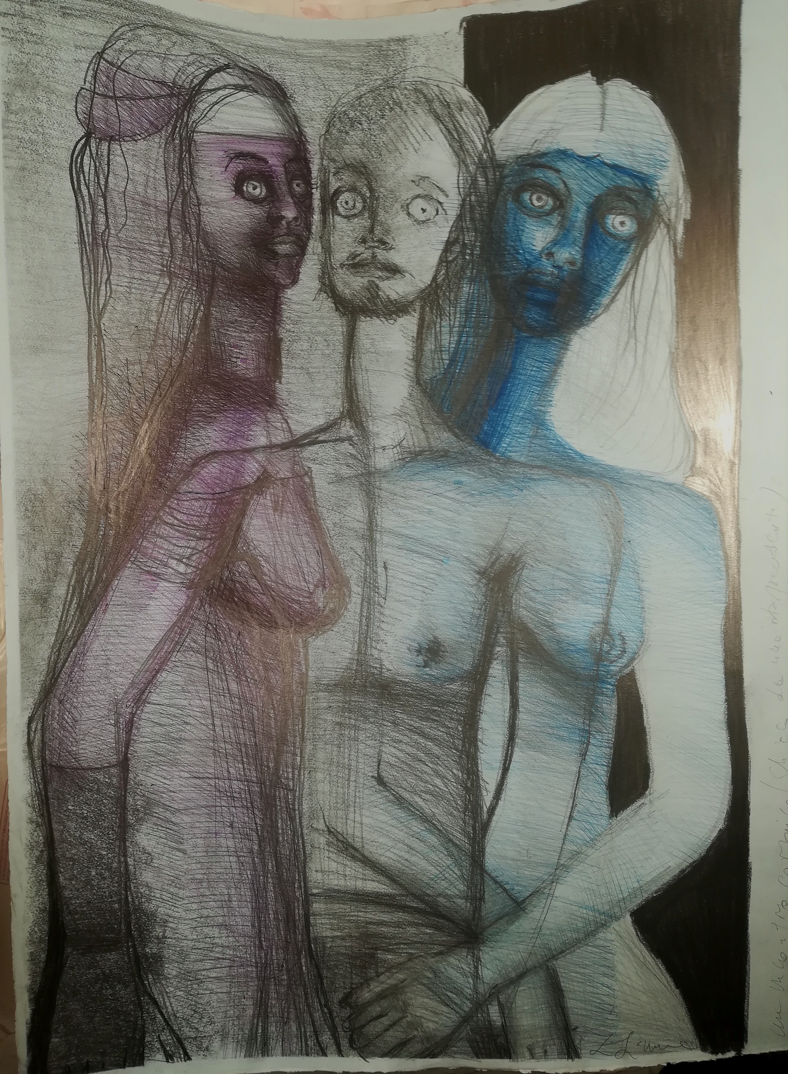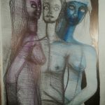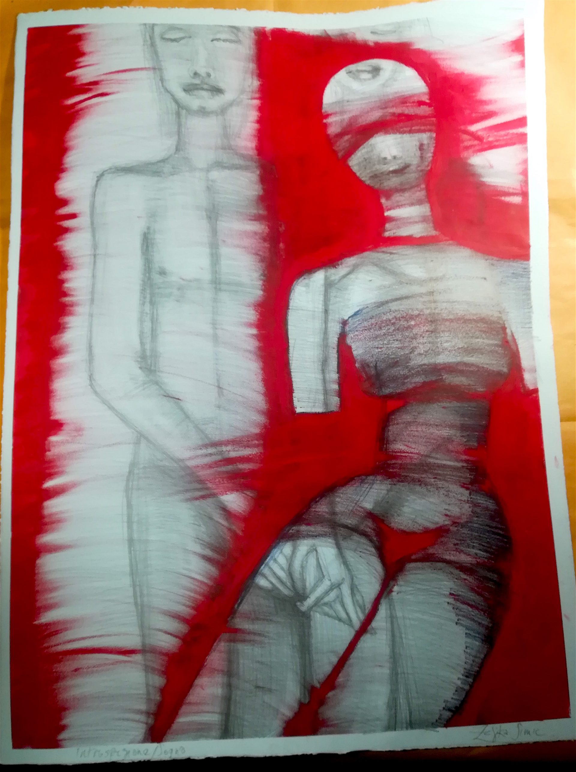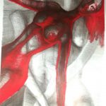 la personale è composta da disegni a matita e tecniche miste su carta da 300 grammi dimensioni 60×70; essi appaiono in fila come fotogrammi nel loro movimento, ogni fotogramma è un racconto a sè realizzati con graffite nera e pastello ad olio rosso cadmio. Rosso e Nero come Stendhal ….
