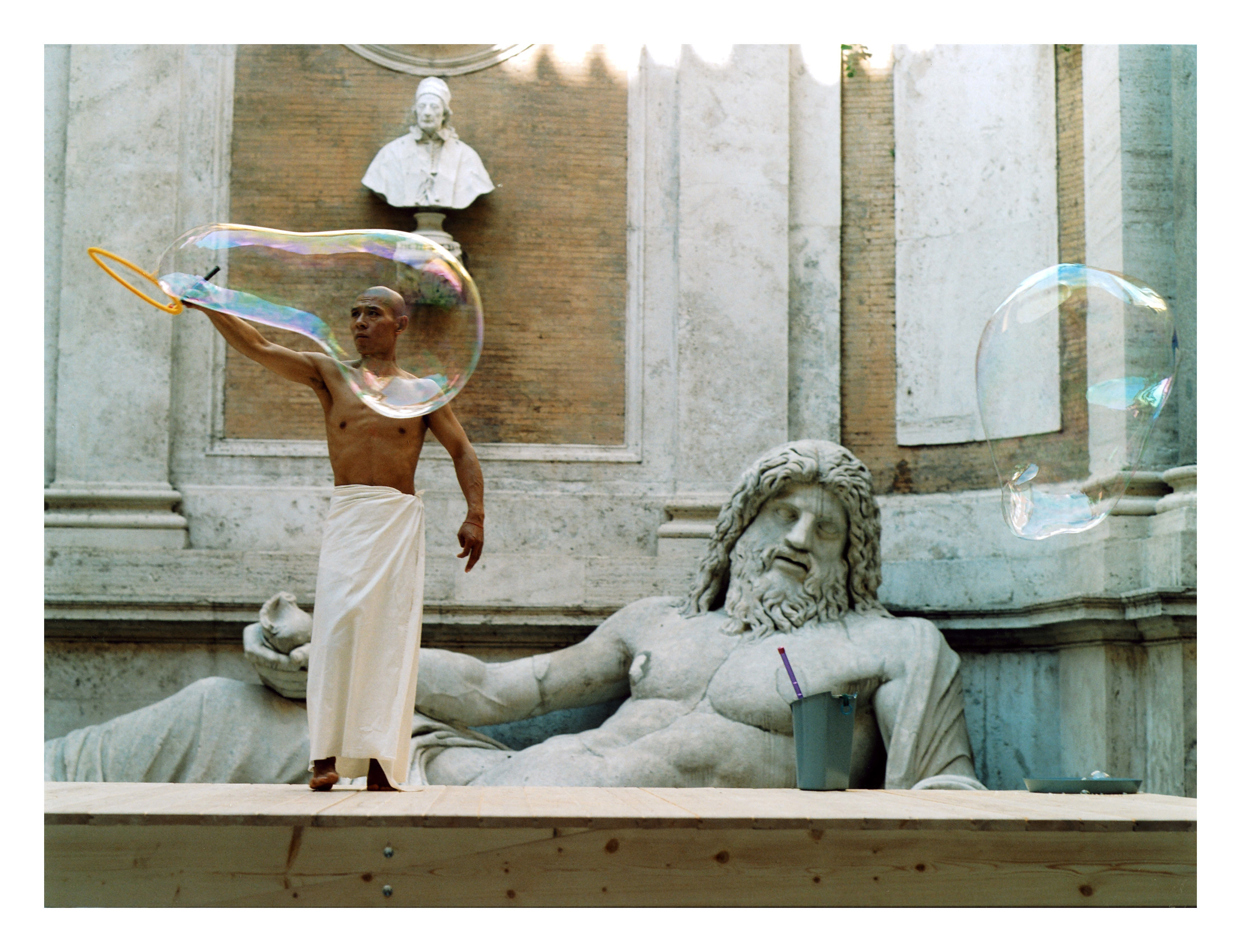 Nella sequenza fotografica, l’azione di Huan, posizionato tra le statue, dà vita a una lenta improvvisazione corporea che richiama le tradizionali tecniche del Tai Ji Quan; e così, i 30 performer coinvolti diventano materiale umano in movimento per la costruzione di una gigantesca scultura vivente che prende forma sopra un tavolo ligneo. L’intensa fisicità della scena, pregna di rimandi alla cultura e alla sensibilità orientali, si mescola alla storia millenaria di Roma e alla marmorea bellezza dei calchi antichi, in un’ideale babele organica figlia della contemporaneità.