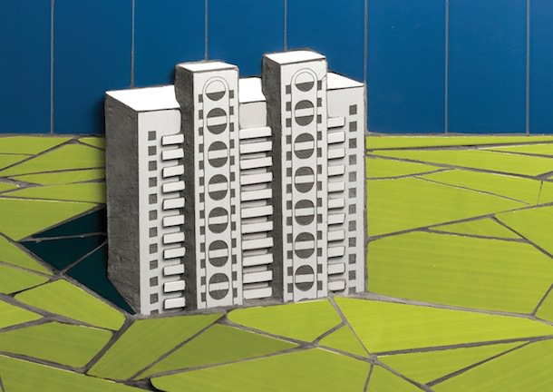 L’eredità formale del tradizionale mosaico sovietico si declina, nella mostra sangimignanese, in una serie di nuovi lavori che hanno come soggetto un aspetto del paesaggio urbano toscano, quello delle case popolari. Zhanna Kadyrova impegnata socialmente e politicamente (ricordiamo che l’artista è membro del collettivo R.E.P. Revolutionary Experimental Space, nato durante la Rivoluzione Arancione svoltasi in Ucraina nel 2004), anche in questo caso si mostra incline ad un’analisi sociale del territorio offrendoci una riflessione sulla dimensione politica dell’edilizia popolare in Italia. Queste nuove opere prendono le mosse da una serie di foto ma utilizzando ceramica, cemento e cartongesso, si collocano a metà tra la scultura e la bidimensionalità di una pittura.