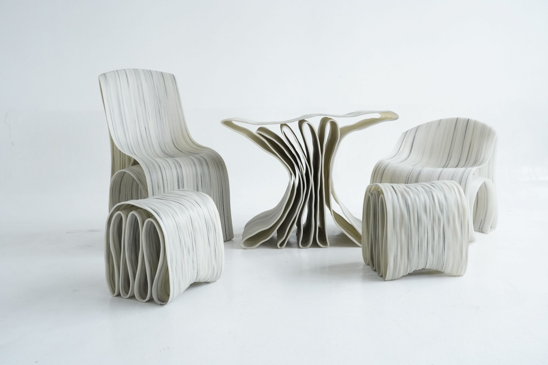 Nubi Chair della serie ‘Ink Line’, una seduta dalla forma organica con una superficie curva e liscia che si adatta al corpo umano. La serie ‘Linea d’Inchiostro’ si ispira ai tradizionali dipinti cinesi a inchiostro, riflettendo la ricchezza delle variazioni create dalla messa a fuoco, dall’intensità, dal peso, dalla leggerezza e dalla chiarezza della china. L'opera è realizzata con stampa 3D in materiale di resina, fuso in strati di linee intrecciate. Come le linee tracciate da un pennello immerso nell’inchiostro, le tonalità di inchiostro e lavaggio sono le variabili nel processo di produzione, rendendo ogni pezzo unico.