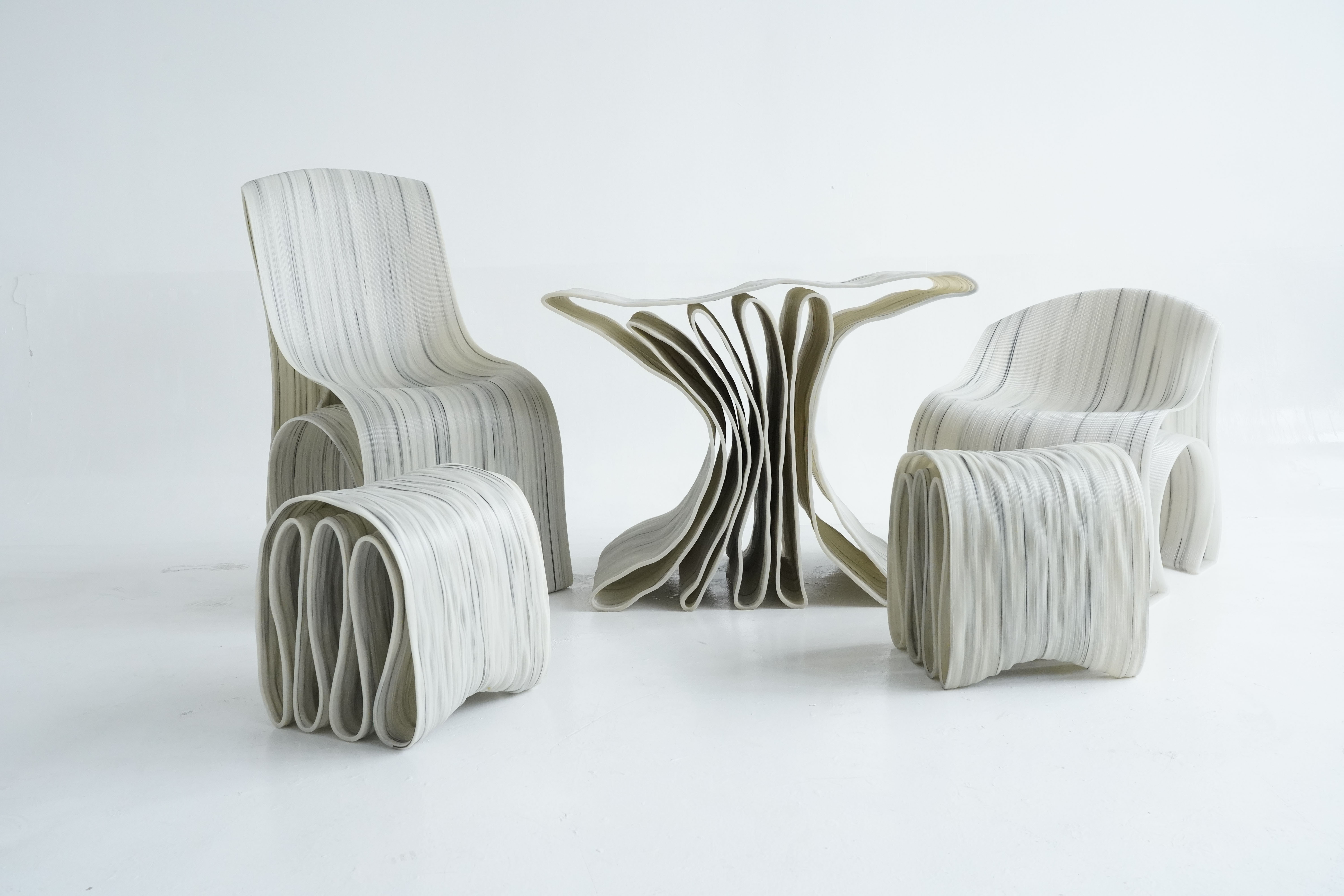 Tavolino e sgabello della serie ‘Free Growing’, ovvero crescita libera. La “de-funzionalità” proposta in questa serie è una riflessione sulla società moderna, così votata alla comodità da essere diventata chiusa e incapace di evolversi e crescere. In antichità, invece, gli uomini imparavano a adattarsi e a sopravvivere, attingendo agli strumenti che la natura forniva loro: legna, foglie, cortecce e terra per difendersi, per cacciare, per scaldarsi e per creare rifugi. In questo senso, il tavolino e lo sgabello sono progettati per imitare la forma delle foglie delle piante. Possono oscillare, essere instabili, quasi venir meno alla loro funzione, per dare un senso di dis-comfort al fruitore e sollecitare il suo spirito di adattamento e dunque di crescita. Visivamente ispirati alla tradizionale pittura a inchiostro cinese, i cambiamenti casuali in bianco e nero durante il processo di produzione sono diventati il tema cromatico di questa serie. Tavolino e sgabello sono realizzati in PETG, poliestere termoplastico, con stampa 3D.