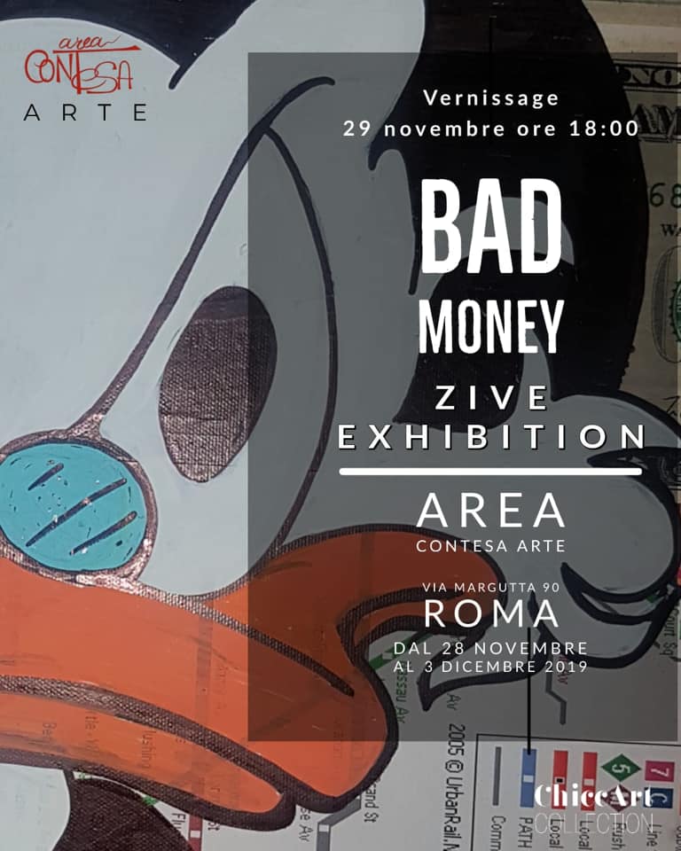 Area Contesa Arte presenta il nuovissimo ciclo di opere dell’artista Zive con la personale BAD MONEY presente nella Sala Modigliani dal 28 Novembre al 3 Dicembre 2019.In questo ciclo Zive associa i cattivi dei cartoons alla tematica semiseria dei Money declinando, in questo caso, l'aspetto prettamente consumistico dei soldi e delle carte di credito ai vizi personali dei personaggi che caratterizza amplificandone l' immagine. La possessività, il potere crudele, la smania di ricchezza o l' avarizia sono solo alcuni vizi che scaturiscono dal Dio denaro e Zive li racconta creando un ciclo in cui sovrappone il cattivo al Money Power.