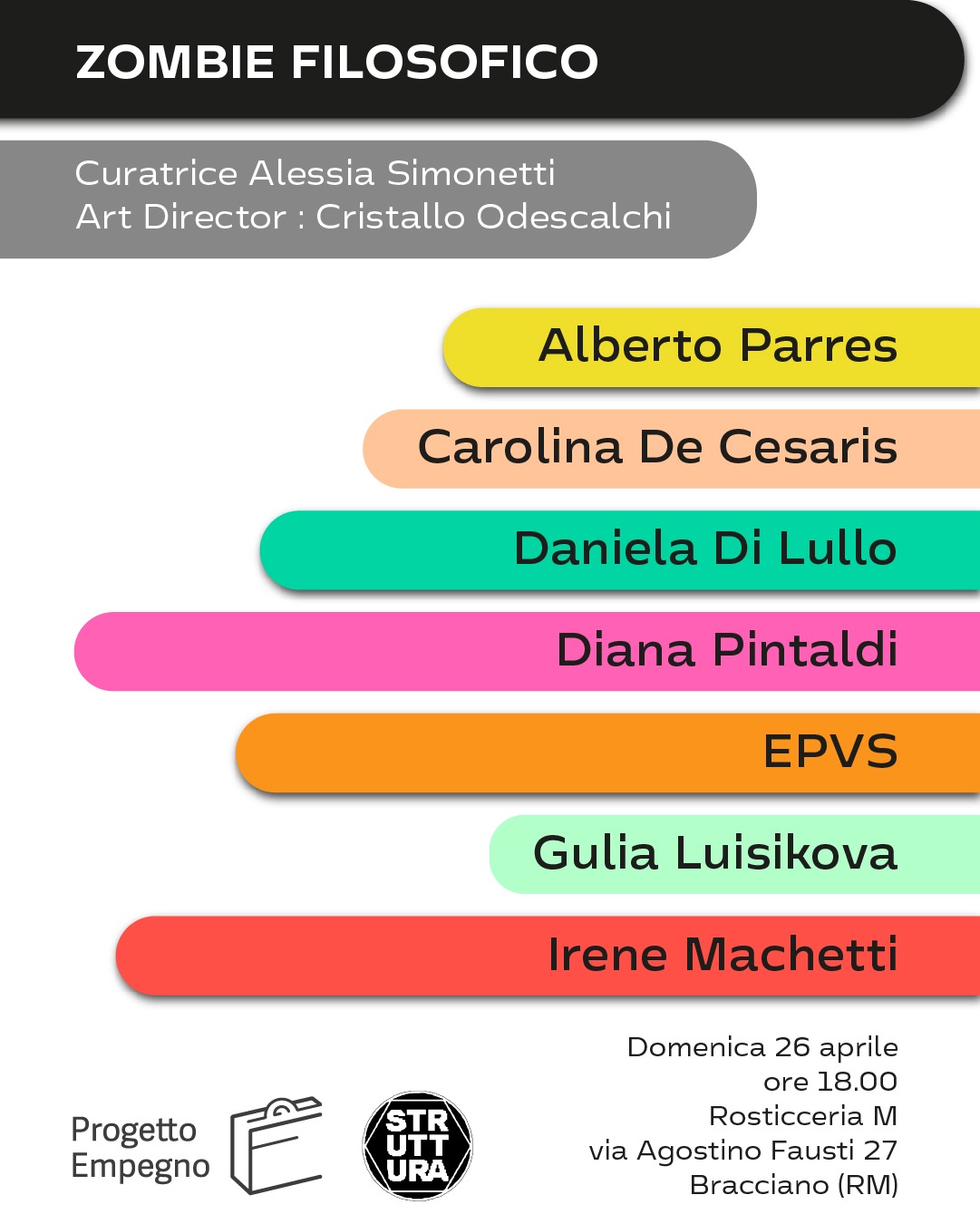 Dal 26 aprile al 24 maggio 2026, lo spazio Rosticceria M presenta 'Zombie Filosofico', una mostra collettiva ideata da Cristallo Odescalchi e curata da Alessia Simonetti.