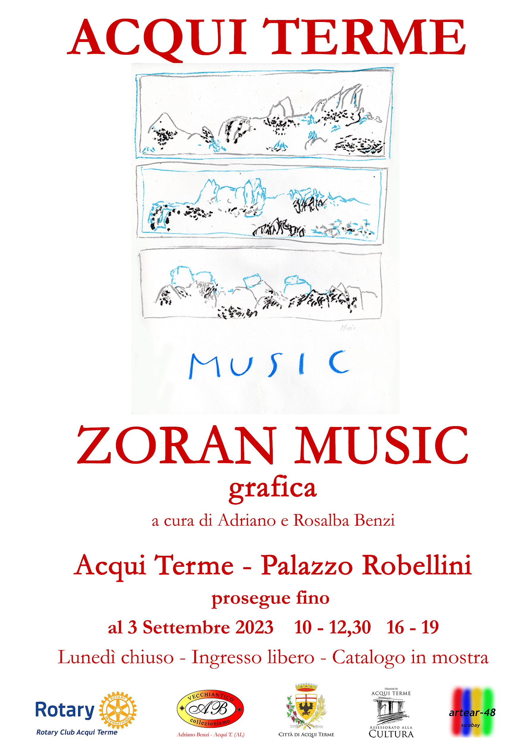 “ ZORAN MUSIC - grafica” Anton Zoran Mušič (Boccavizza / Bukovica, 12 febbraio 1909 – Venezia, 25 maggio 2005) collezione Adriano e Rosalba Benzi Acqui Terme Palazzo Robellini - Piazza Levi Inaugurazione Sabato 15 Luglio 2023- ore 18,30 La mostra, “ ZORAN MUSIC - grafica” intende ricordare il grande artista, profondamente Italiano, nato in una famiglia di lingua slovena nel villaggio di Bukovica/Boccavizza presso Gorizia (allora parte della Contea di Gorizia e Gradisca), oggi Slovenia. Consiste in una rassegna di circa 70 opere (calcografie-acqueforti, litografie, serigrafie, libri d'artista) che ripercorrono le tappe fondamentali del suo lavoro. Music è considerato uno dei massimi artisti del XX secolo e si colloca anche nell'olimpo degli artisti specializzati nella grafica. L'artista è stato anche un pittore, disegnatore, acquarellista capace di effettuare sostanziosi interscambi artistici tra l'incisione e la pittura modulando ed influenzando, ora nell'uno ora nell'altro campo, invenzioni ed emozioni. Music ha partecipato alle più importanti rassegne artistiche nazionali e internazionali ed ha esposto in numerosissime mostre personali in Italia e all’estero. A corredo dell’esposizione un catalogo con tutte le immagini in gruppi omogenei e commentate da scritti di Gianfranco Schialvino.