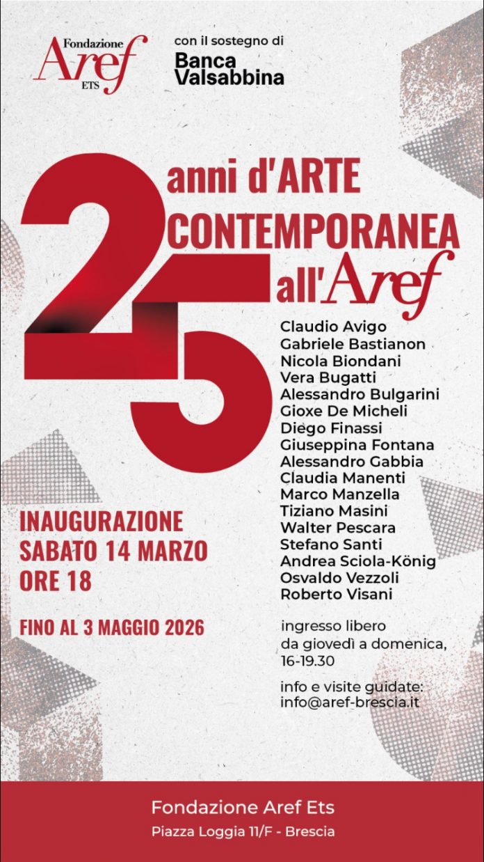 Sabato 14 marzo alle ore 18 presso la Galleria di SpazioAref si inaugura la mostra 25 anni di arte contemporanea all’Aref, una collettiva con 17 artisti: Claudio Avigo, Gabriele Bastianon, Nicola Biondani, Vera Bugatti, Alessandro Bulgarini, Gioxe De Micheli, Diego Finassi, Giuseppina Fontana, Alessandro Gabbia, Claudia Manenti, Marco Manzella, Tiziano Masini, Walter Pescara, Stefano Santi, Andrea Sciola-König, Osvaldo Vezzoli e Roberto Visani. L’esposizione rimarrà aperta ad ingresso libero fino al 3 maggio 2026, dal giovedì alla domenica dalle 16 alle 19.30.