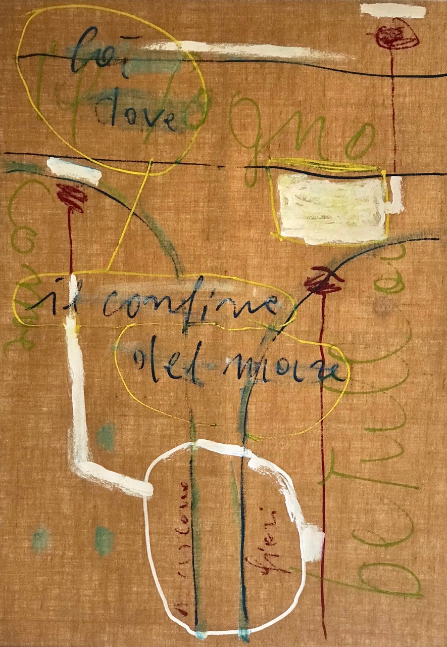 Fondamentalmente il mio lavoro attinge ai “paesaggi raccolti nella psiche” come descritti da Vittorio Lingiardi, psicoanalista, nel suo bel libro “Mindscapes. Psiche nel paesaggio”. Nella produzione mi affido alla spontaneità e alla velocità di esecuzione, il caso è elemento costitutivo. Precise costellazioni emotive del momento che vivo o affioranti da antiche memorie determinano il ritmo dei segni, del gesto, che può essere veloce o lento ampio o “coartato”; opero comunque nel costante esercizio percettivo volto a cogliere e gestire l’imprevisto come favorevole elemento perturbante creativo; non parto da un’idea o un pensiero preciso: semmai questi si costruiscono strada facendo fino a quando l’opera in produzione risponde a precisi requisiti di resa emotiva, estetica, cognitiva. Il titolo che do a volte suggerisce la strada di lettura, altre volte marca la necessità di spaesamento e confina con l’esigenza poetica.
