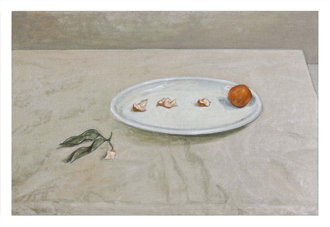 Nei dipinti della serie Hunter, figure colte in gesti minimi e quotidiani — un uomo intento a lanciare bucce di mandarino o un giovane che trattiene una zolletta di zucchero sopra una tazza — diventano immagini di concentrazione, attesa e sospensione. Accanto a queste, gli still life, da intendersi nel senso letterale del termine, introducono leggere dissonanze: una natura composta, in cui elementi familiari si combinano in modo inatteso, come nel caso del tegame con dei limoni in cui è la presenza incongrua di una pallina da tennis.