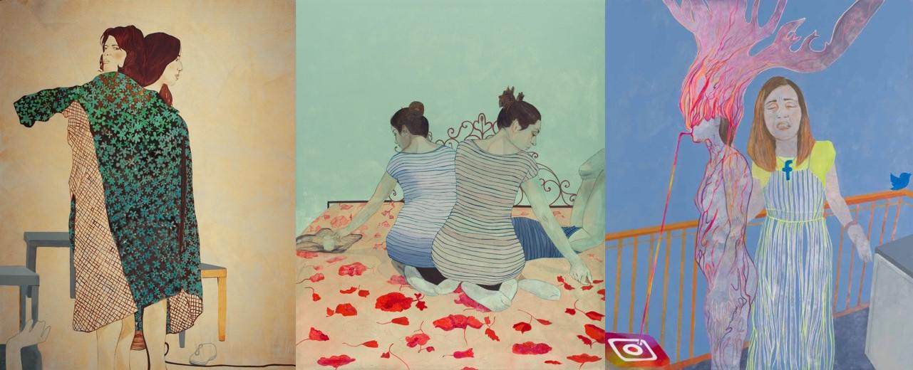 Ecco allora “Il Giardino delle Alchimiste” dove due donne simili sembrano specchiarsi l’una nell’altra attraverso il movimento di un abito fiorito dal risvolto geometrico. Oppure il potente “Morgana” dominato da altre due figure femminili riprese di schiena e sedute su un giaciglio puntellato di fiori rossi, in una camera incantata in cui tutto si moltiplica e perde sostanza: l’illusione di galleggiare in altre dimensioni, anche nell’era digitale, pare depositarsi sulla tela con un arcaico pennello. Una riflessione che affiora anche in “Socials Tedium”, dove il nostro avatar assorbe il distillato di una vita digitale diventata altenativa al reale.