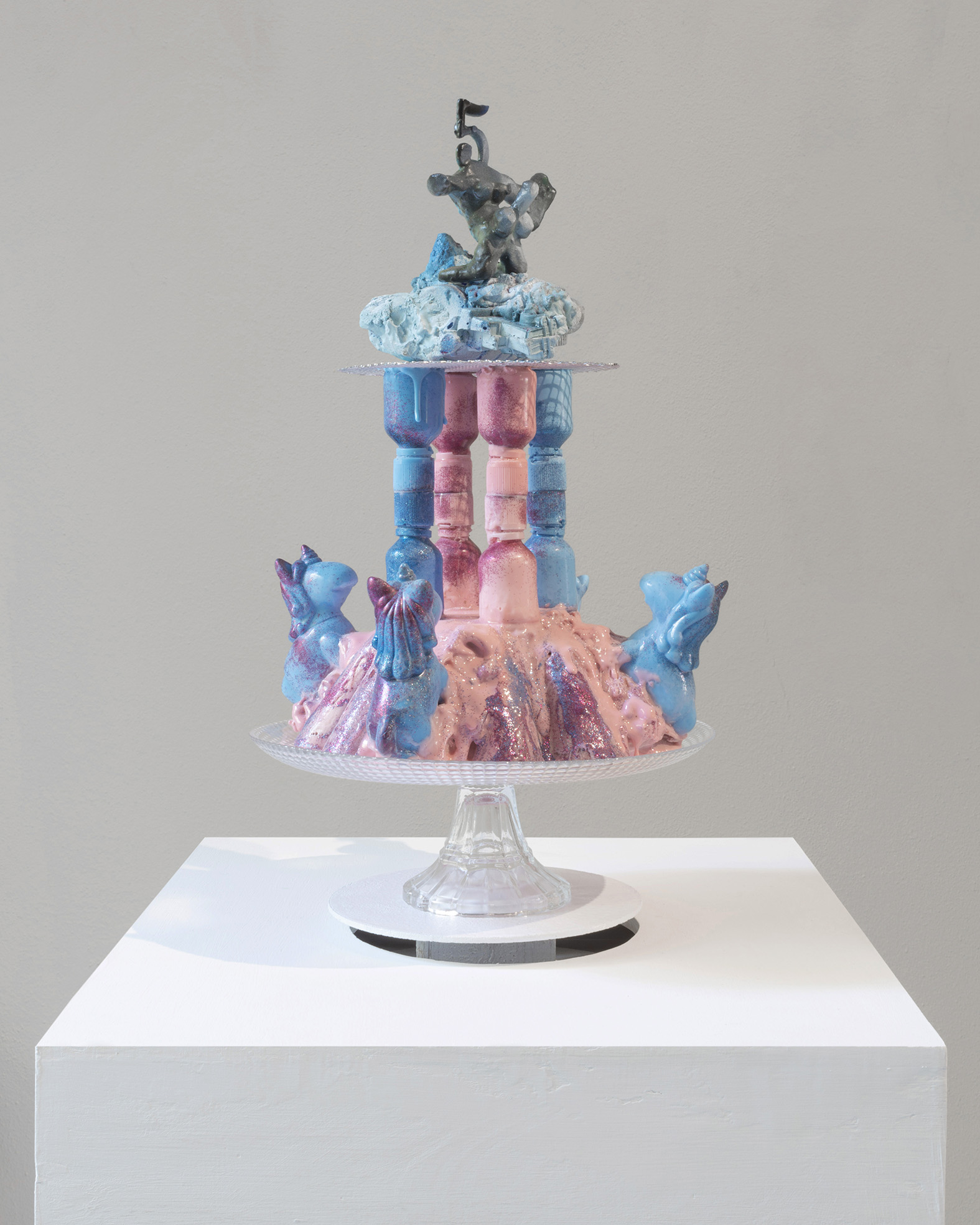Ho inserito poi la serie Familiar pics avviata nel 2019. É composta da disegni, disegni su carta scottex, collage, ricami, sculture. Anche le cornici diventano scultoree: si trasformano in corpi ibridi, nel quale si raddensano elementi quotidiani, scarti, residui di forme di vita. Compleanno #5 è una torta fatta di unicorni, boccette di antidepressivo, macerie: un tempio alla decadenza.