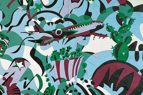 E poi i dipinti di grande formato e l’approdo a New York, dove Nespolo sperimenta con la fotografia e la scenografia teatrale, così come la costumistica di scena, realizzandosi a livello internazionale in molteplici campi, compreso il fervido contributo alla comunicazione visiva di Enti e aziende.