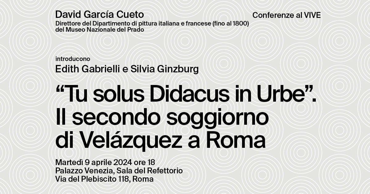 La conferenza dal titolo “Tu solus Didacus in Urbe” si inserisce nel ciclo di incontri “Viaggi e soggiorni di artisti a Roma” curati da Silvia Ginzburg, professoressa ordinaria di Storia dell’Arte Moderna all’Università di Roma Tre. L’evento si concentrerà sul secondo soggiorno di Diego Velàzquez a Roma e ospiterà l’intervento di David García Cueto, Direttore del Dipartimento di pittura italiana e francese (fino al 1800) del Museo Nazionale del Prado.