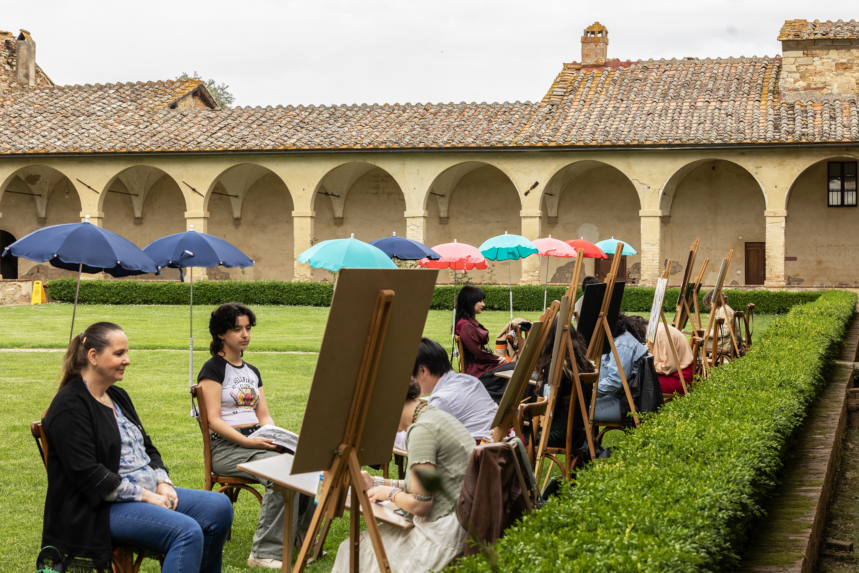 La dimensione formativa attraversa tutta la manifestazione: grazie ai progetti di alternanza scuola-lavoro, gli studenti dei licei artistici toscani diventano attori in scena, tra ritratti dal vivo, gadget sviluppati con stampanti 3D e un concorso di illustrazione dedicato alle scuole primarie e secondarie. Accanto a loro, laboratori per famiglie e bambini, workshop di ceramolle e calcografia con la Fondazione Il Bisonte ETS, collage ispirati al kintsugi, calligrafia partecipativa, oltre a incursioni musicali e performative – dalla band Musica da Rispostiglio all’Orchestra AMF, fino alle coreografie site specific di Somethingelse Dance Company – ampliano la grammatica del segno in una drammaturgia corale. Completa l’esperienza il racconto del luogo: visite guidate agli affreschi di Poccetti e alla Crocifissione di Francesco Vanni, soste enogastronomiche curate dal ristorante Il Chiostro di Pontignano e un bookshop dedicato all’editoria illustrata e ai progetti degli artisti ospiti