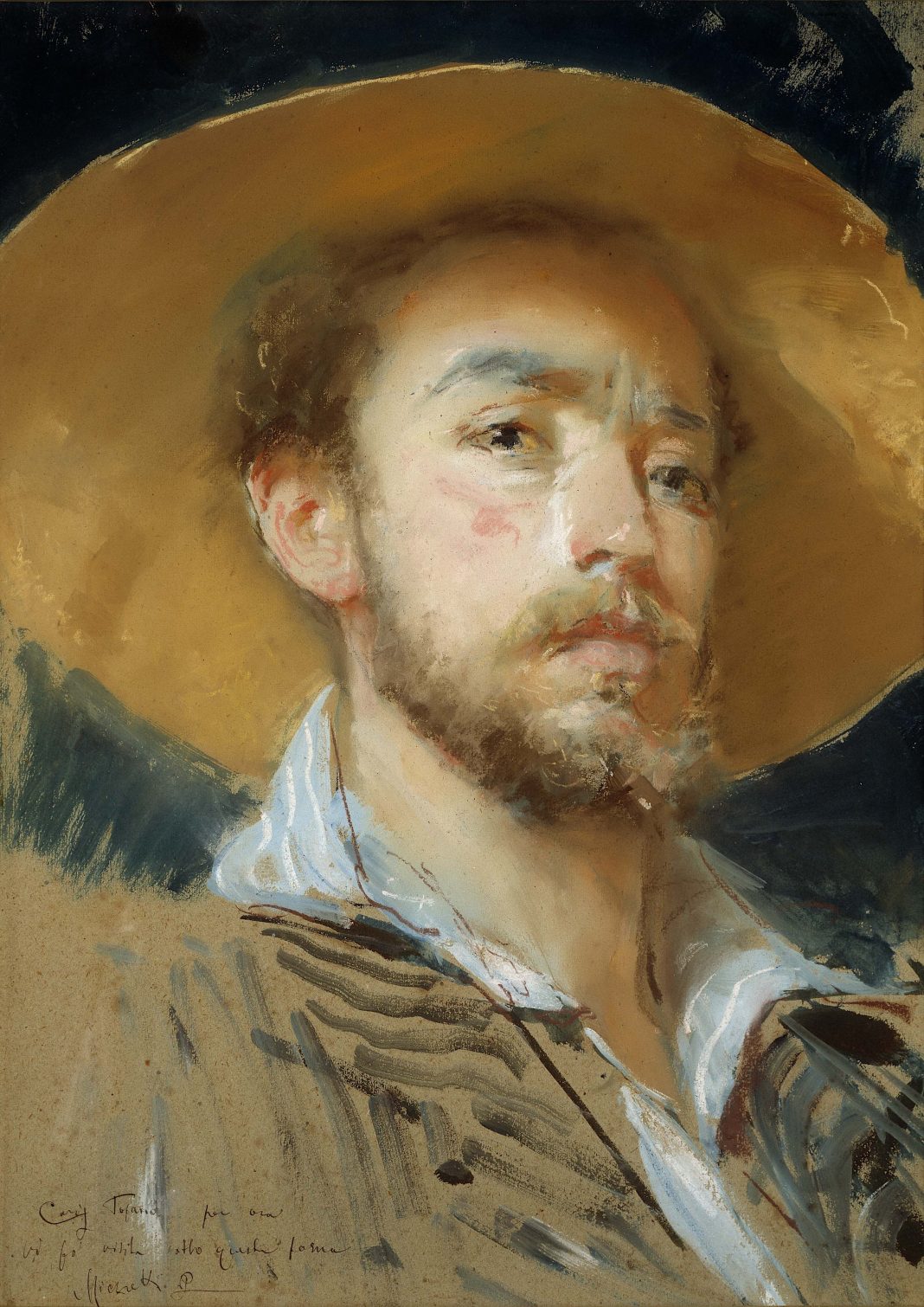 - ANTONACCI LAPICCIRELLA FINE ART. Francesco Paolo MICHETTI. (Tocco da Casauria 1851 – Francavilla a mare 1929), Autoritratto con cappello, 1880 circa. Pastello e tempera su carta bruna