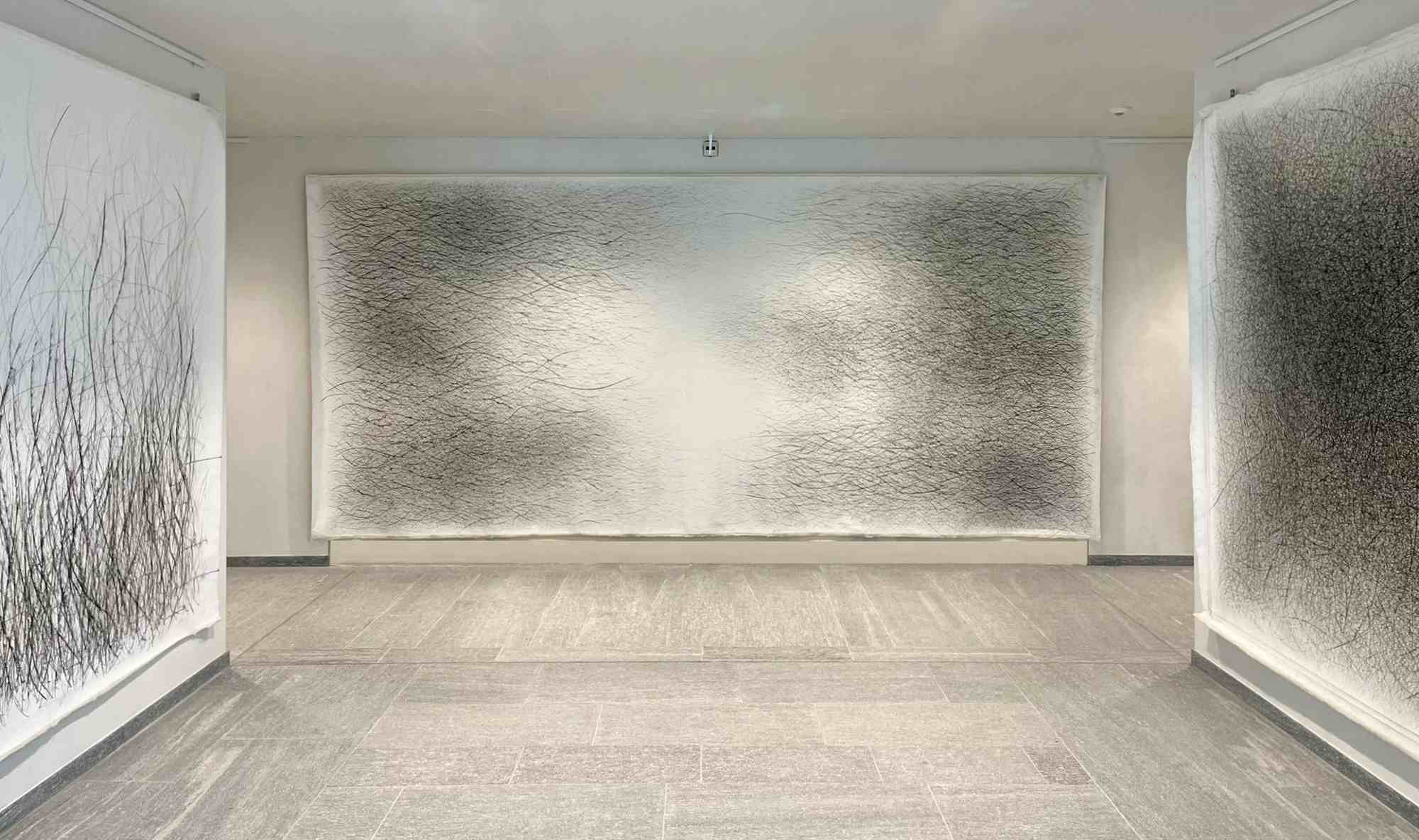 Negli spazi espositivi, Jaime Poblete (1981, Cile) presenta i suoi «tessuti pittorici», frutto di un continuo dialogo tra il ricordo delle sue radici sciamaniche e l’arte europea dei maestri del colore e del minimalismo. Le sue tele vengono cucite e piegate in un atto performativo, rese, quindi, “contenitori”, capaci di nascondere qualcosa e, allo stesso modo, di racchiudere il vuoto. In questa dualità, le opere di Poblete sono il prodotto della sua gestualità, di cui siamo in grado di ripercorre i passi grazie al suo personale uso del colore, che deborda, migra o diventa nero.