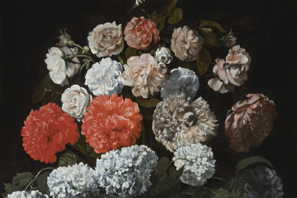 Natura morta con ortensie e rose in fiore in un vaso d’anfora