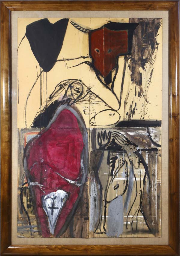 - Lot 180 – Mimmo Paladino, Senza titolo, 1984, Olio, gouache e collages di cartoni su tela applicata su tavola in cornice di legno massiccio, cm 220,5×150 (opera) – cm 240x168x8 (cornice) (Stima € 70.000/100.000)