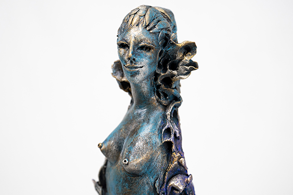 La Nascita di una Dea (2017) fa parte della serie “Quiete” e verosimilmente riporta alle origini di Venere, secondo i miti più noti. Ideale universale della bellezza e dell’amore, la sua nascita può però nascondere il frutto della violenza. L’affusolata figura femminile emerge da flutti che l’avvolgono come un mantello spumeggiante. Il suo nome greco Afrodite (aphròs), significa infatti schiuma, sostanza da cui, secondo Esiodo, la dea scaturì presso l’isola di Cipro, dove tra le onde erano caduti il seme e il sangue di Urano, evirato dal figlio Saturno, per vendicare la madre Gea. Ma tra i riccioli con patine color del mare, emergono anche gusci di conchiglie, da cui, stando alla versione di Omero, sarebbe nata la stessa dea, figlia di Giove e della ninfa degli oceani Dione, divenendo portatrice di fecondità e della natura primaverile.