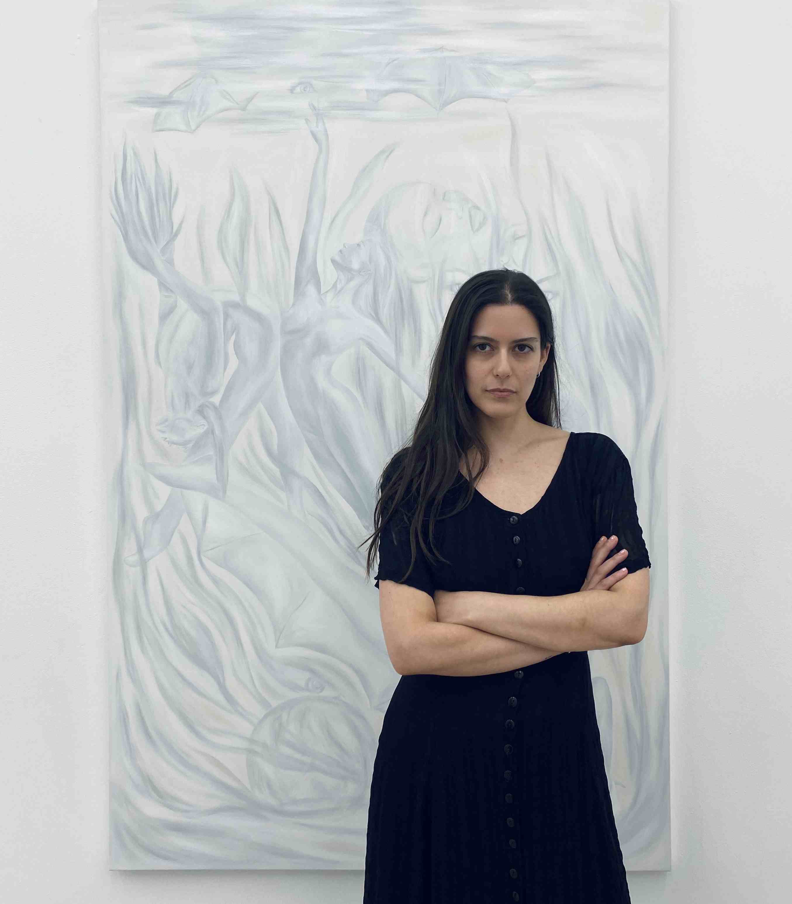 Nei suoi dipinti dalle atmosfere oniriche, Amalia Vekri riproduce narrazioni che ruotano attorno alle Anguane, in quanto metafora della potenza e dell’energia femminile. Attraverso i loro mutamenti, le ninfe attraversano sfide fisiche e spirituali che permettono loro di raggiungere una maggiore conoscenza e consapevolezza del mondo che le circonda, dunque di acquisire potere. Il titolo “On Becoming” è un riferimento agli stati trasformativi di queste creature, al loro continuo diventare altro da sé, in una indeterminatezza che ne sfuma i confini e i contorni. Le creature trascendono ogni legge naturale e mutano verso un’esistenza senza tempo, immortale e diafana. Per questo, i dipinti di Amalia Vekri riproducono forme fluide e vegetali che si fondono in ambienti che paiono sciogliersi o compenetrarsi in un mondo unificato e compatto. Allo stesso modo, gli spiriti femminili sembrano fluire e fluttuare all’interno di questi universi, ricreando pose elastiche, fluide e danzanti. Come sirene eteree, le sue ninfe volano, rinascendo sempre nel tempo.