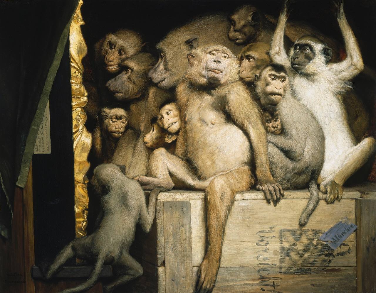Gabriel von Max (1840-1915), Scimmie come critici d’arte, olio su tavola, Neue Pinakothek, Monaco. Foto Bayer & Mitko. Credits Bayer & Mitko/Artothek/Archivi Alinari.