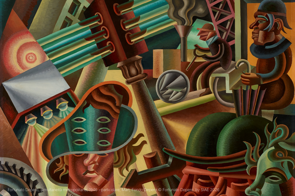 - Fortunato Depero, Simultaneità metropolitane, 1946 – particolare, Mart, Fondo Depero © Fortunato Depero, by SIAE 2026