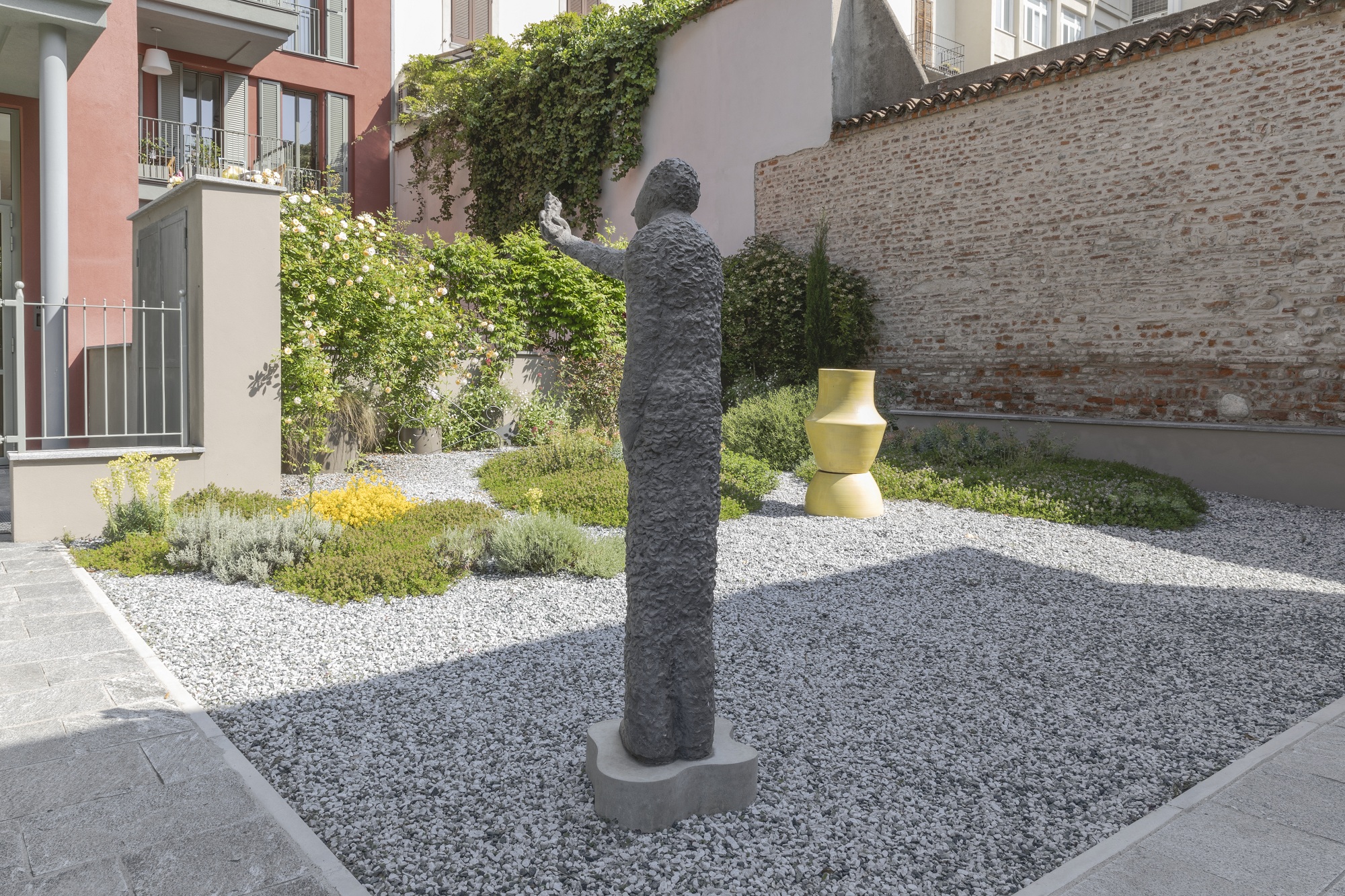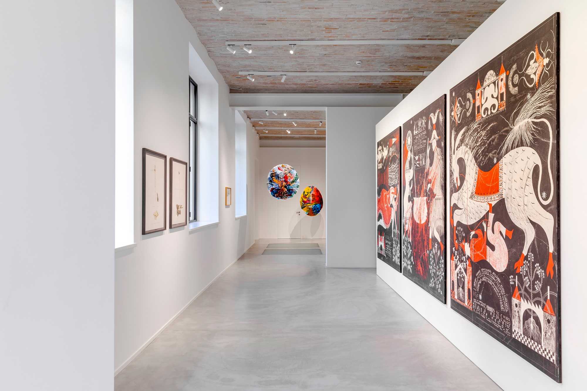 La mostra si apre all’esterno della Fondazione, dove sono installate alcune opere nate nei borghi e successivamente trasposte a Milano: il grande Abracadabra di GRJB, visibile sulla facciata, proveniente da Pietragalla (Basilicata); il neon di Margherita Moscardini da Corinaldo (Marche); una statua in cemento della serie Phone User di Judith Hopf; le sculture di Agostino Quaranta dedicate al ritorno onirico del lago Fucino e un fregio in ferro di Binta Diaw, nato da una tappa piemontese del progetto; la scultura di Lucia Cantò, realizzata a Malamocco nella laguna veneziana. All’interno, gli spazi della Fondazione sono stati ripensati in relazione ai contenuti della mostra. Al piano terra, oltre alle torri-sogno di Matteo Nasini realizzate per il borgo di Soverato Vecchia (Calabria), sono in mostra una selezione di disegni, bozzetti e opere su carta: dal bozzetto di Gaia Di Lorenzo, che ritrae il portale del Palazzo Ducale di Pietramontecorvino (Puglia), fino ai “disegni performativi” di Antonio Della Guardia, o ai grandi tondi pittorici su carta di Alice Visentin, che evocano presenze sospese legate al borgo di Avise (Valle d’Aosta). In questa sezione si aggiungono due nuove produzioni site-specific: il disegno cartografico di Simone Carraro, e l’installazione site-specific di Mattia Pajè che prosegue il racconto di Pila Thinkerwiller, realizzato nel borgo umbro di Toscolano.
