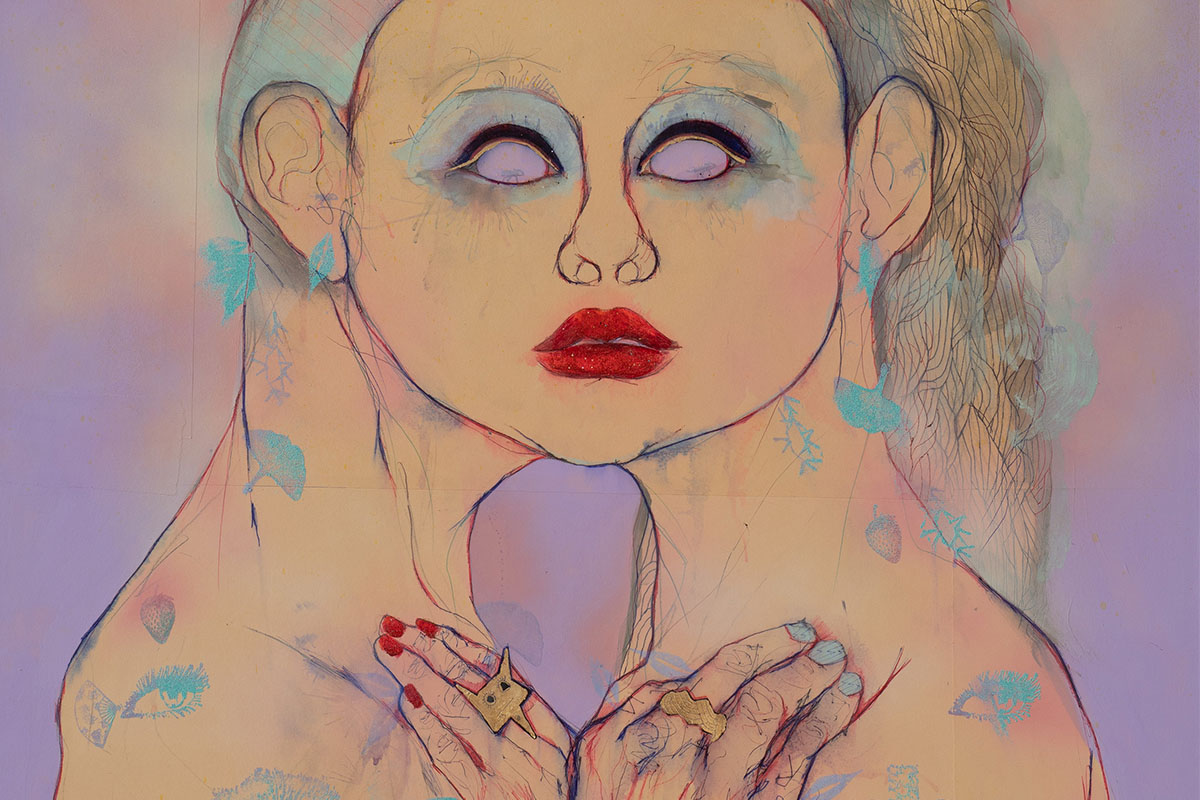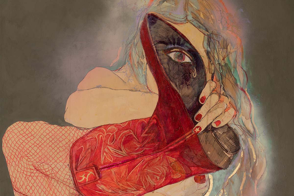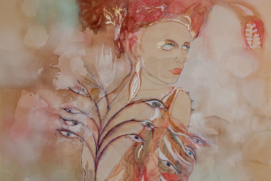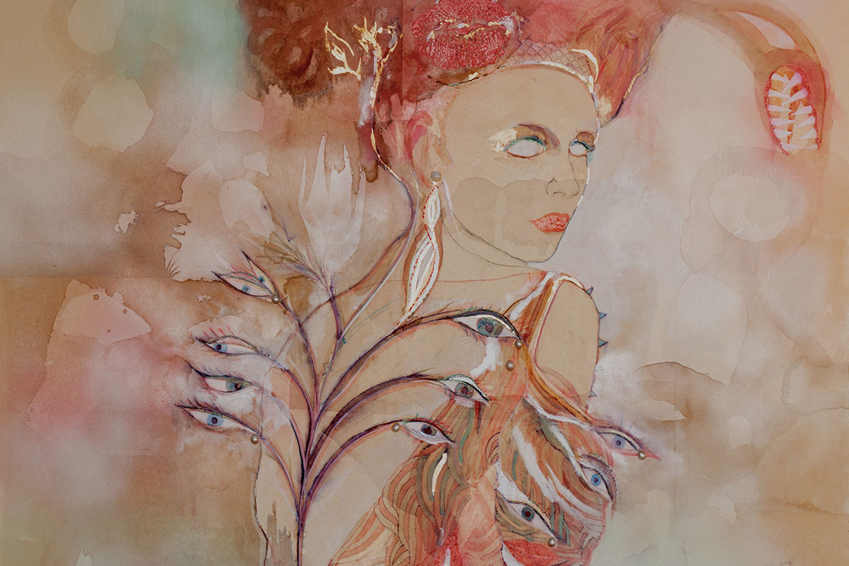 La figura ritratta è una delle tante donne archetipiche immortalate da Elena Monzo, colte nel mezzo di una metamorfosi che fa eco alla tradizione classica, mentre gli indumenti moderni che indossano impongono loro un’energia attuale.