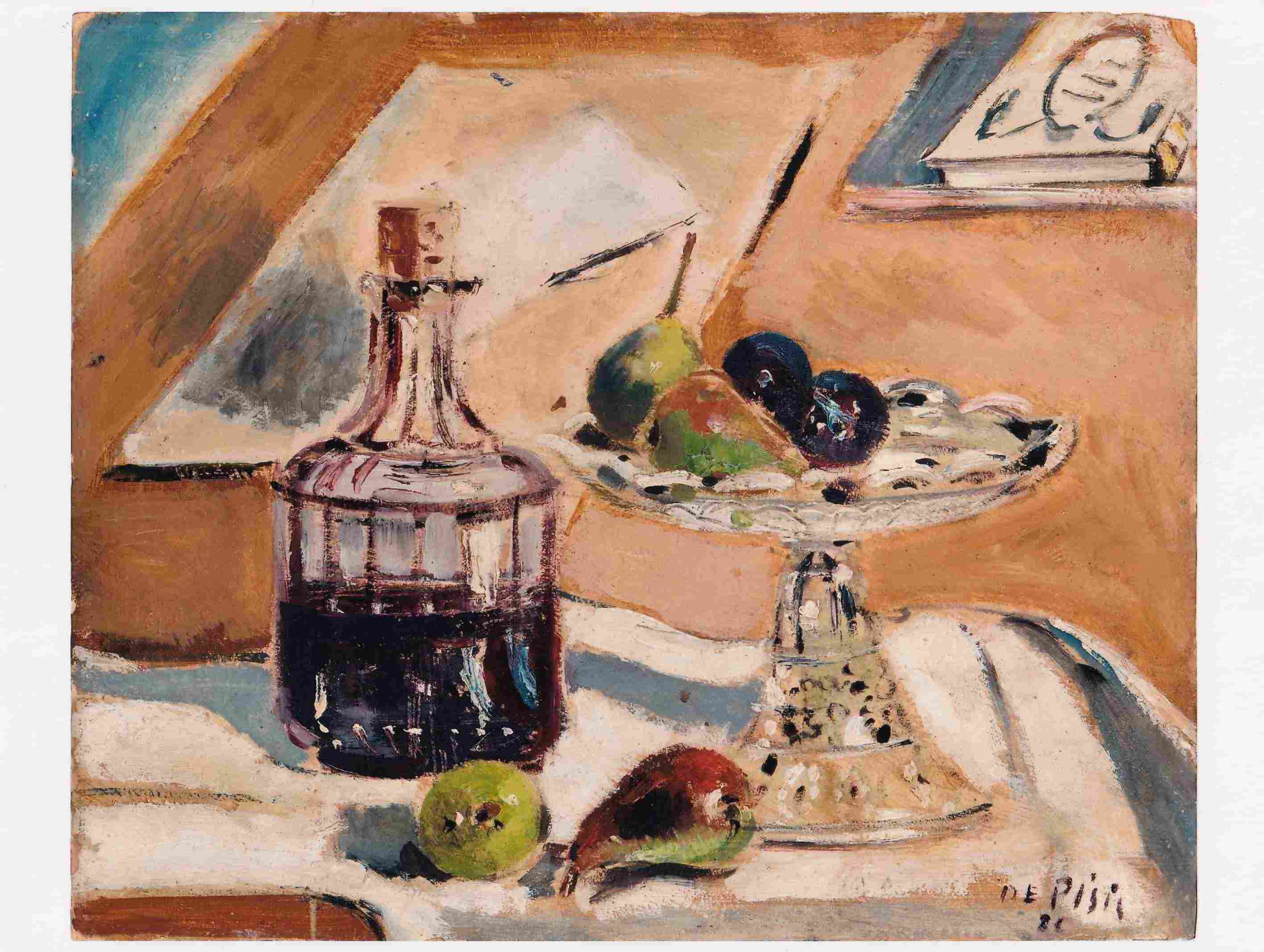 Natura morta con bottiglia e alzata di frutta, 1926