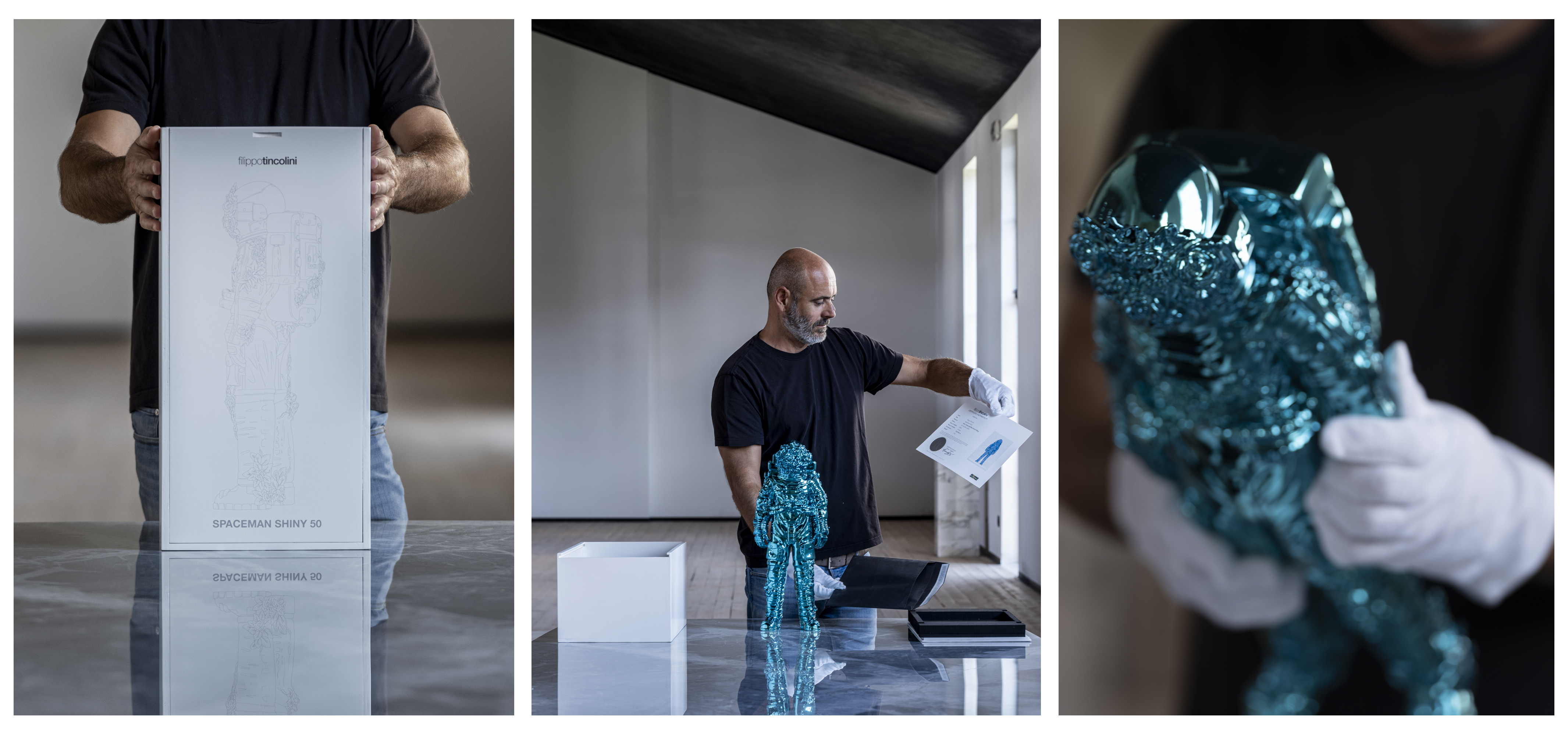 Nelle opere di Filippo Tincolini, l’arte non si esaurisce mai nella sola creazione scultorea, ma si estende alla cura meticolosa con cui ogni pezzo viene presentato e introdotto nel mondo. In questo caso ogni pezzo è imballato in un packaging studiato accuratamente, un packaging che non è solo un contenitore protettivo ma è parte integrante dell’opera. Questo approccio trasforma l’atto del disimballare in un rituale, un momento di scoperta che rafforza il dialogo tra l’opera e il suo pubblico.