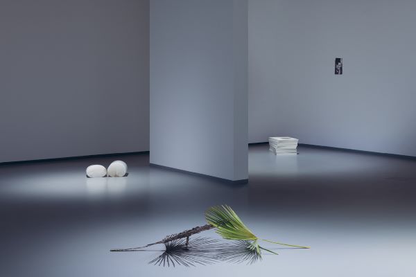 Una di queste, una foglia di marmo nero, intitolata Quando nessuno mi vede, è stata collocata nel giardino del museo, all’ombra di un cespuglio. All’interno le fa eco una scultura di marmo verde, speculare alla prima, intitolata Alla luce del sole. Altre opere si rispondono l’un l’altra nel percorso, tracciando relazioni e rispecchiamenti.