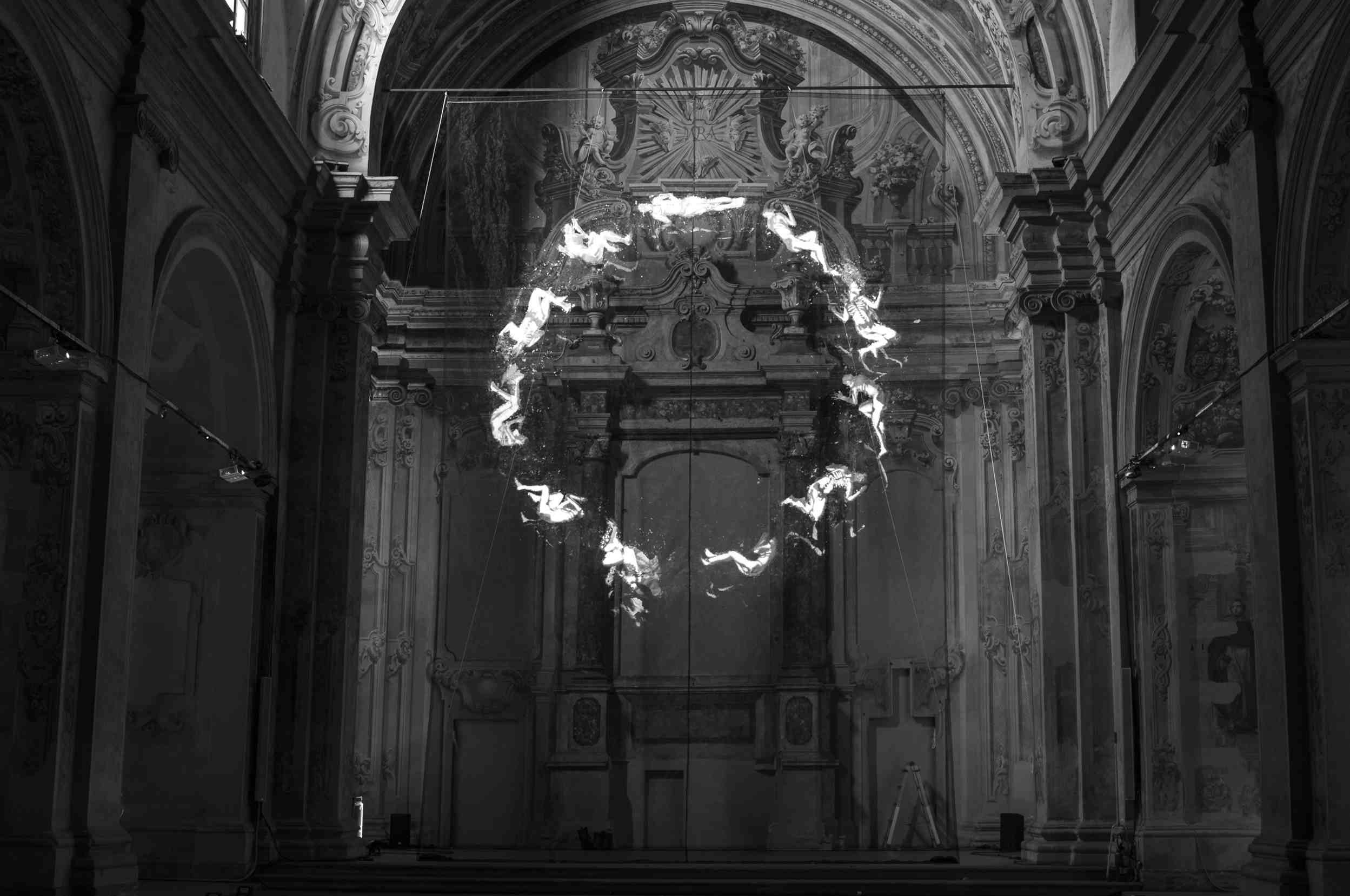 Lasciandosi ispirare dal libro della Genesi, l’artista spagnolo rivisita sensorialmente i primi sei giorni della creazione, utilizzando per la prima volta il video come principale mezzo espressivo. Più di sessanta video, realizzati con tecniche di sviluppo analogico e combinati con l’attuale tecnologia 3D, sono distribuiti nelle sei cappelle e l’altare, raccontando visivamente i sei giorni del mito della creazione in una transizione tra passato e presente e in un’intempestiva conversazione tra patrimonio e creazione contemporanea. Le pareti non sono solo un supporto per le immagini o i video, ma lo spazio viene trasformato dall’artista in un vero e proprio habitat immersivo con cui il visitatore è invitato a interagire attivamente potendo camminare o fermarsi, perdersi o ritrovarsi.