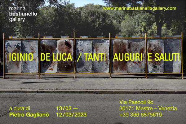 marina bastianello gallery è lieta di presentare la personale di Iginio De Luca Tanti auguri e saluti, a cura di Pietro Gaglianò (dal 13 febbraio al 12 marzo 2023, vernissage sabato 11 febbraio 2023 dalle 18.30 alle 20.30). Tanti auguri e saluti è il progetto che Iginio De Luca ha pensato espressamente per lo spazio della galleria. Due sono i dispositivi attraverso i quali si svolge l’esperienza del visitatore. Il primo, visivo, consiste di una cospicua struttura in tubi innocenti che regge due pannelli sui quali ogni giorno verranno affissi altrettanti manifesti, immagini tratte dai Blitz compiuti da De Luca nello spazio pubblico o da altre opere, sempre connesse alla sfera dei rapporti tra individuo e sistemi di potere. Il secondo dispositivo, sonoro, si concretizza in una struttura analoga dove due casse trasmettono in loop una sequenza di opere audio, tutte realizzate dall’artista sonorizzando materiali e luoghi o rielaborando gli inni nazionali, suprema espressione di un’identificazione collettiva astratta e abusata. Su entrambi i dispositivi veglia un occhiuto megafono, specchiante e rotante, che include il visitatore in una maglia di simboli, tra la protesta e il controllo. La visione complessiva della mostra, con la stratificazione dei flussi visivi e sonori, richiede quindi un lungo tempo di ascolto e il ritorno quotidiano in galleria. A chiosa e conclusione di questo azzardo, in uno spazio appartato e buio lampeggia al ritmo del codice morse un lightbox con l’immagine di un chiosco di fiori e piante, uno dei tanti che illuminano, incessantemente, incomprensibilmente, la notte di Roma. Il messaggio è, naturalmente, Tanti auguri e saluti.
