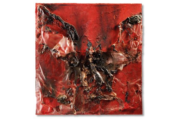 In foto: Alberto Burri, “Combustione plastica”, 1961, plastica, acrilico, combustione su cartoncino, cm 32×31. Opera accompagnata da certificato di autenticità su fotografia rilasciato dalla Fondazione Palazzo Albizzini “Collezione Burri”, Città di Castello, in data 31-05-1993. Stima € 250.000 – 350.000