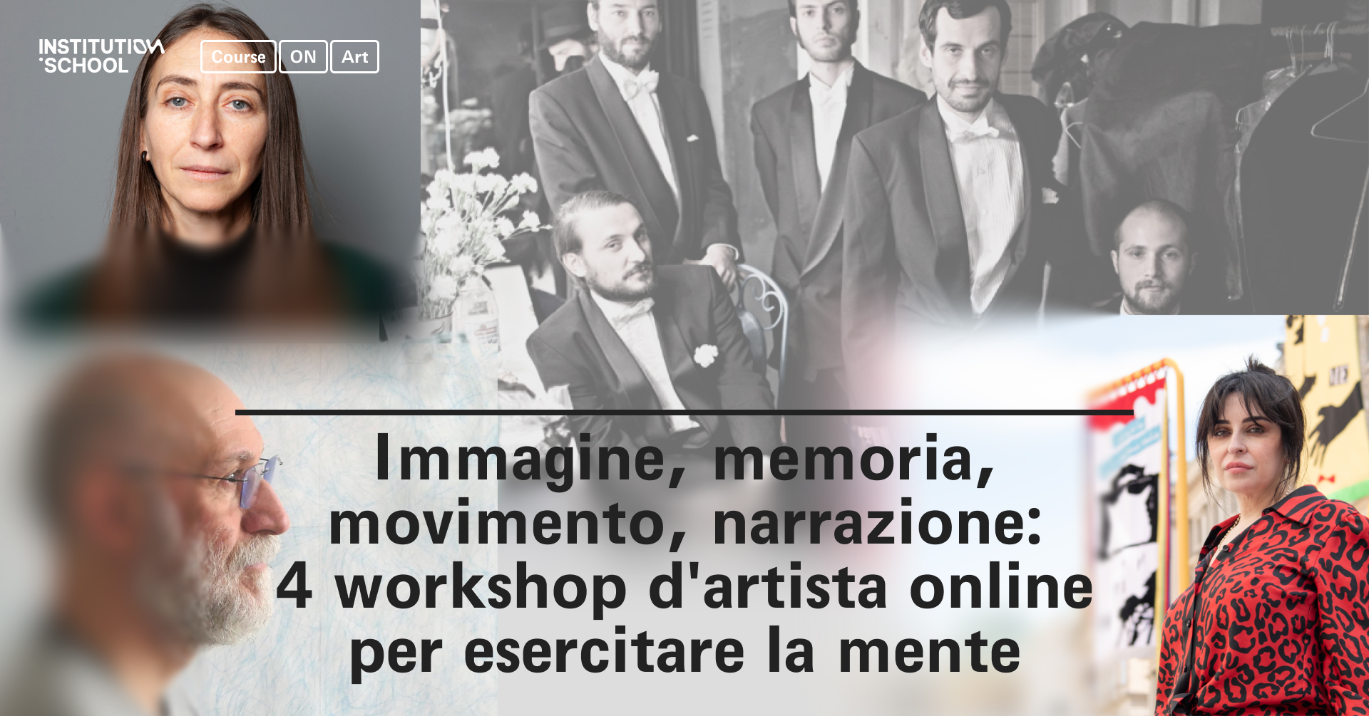 Immagine, Memoria, Movimento, Narrazione (20 aprile – 9 giugno) è un ciclo di quattro workshop indipendenti — uno sull’immagine con Arienti, uno sulla memoria con Moira Ricci, uno sul movimento con Marinella Senatore, uno sulla narrazione e la post-verità con Alterazioni Video. Ogni modulo si svolge in tre o quattro sessioni da due ore, alternando il lavoro dell’artista a momenti operativi seguiti dai tutor di Institution School. I workshop sono pensati per artisti, studenti, e appassionati. Si possono acquistare separatamente (45 euro ciascuno) o come pacchetto completo (140 euro; riduzioni per under 26).