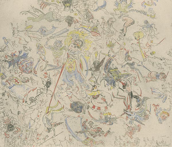 La mostra si concentra sulla produzione grafica di Ensor, mettendo in luce il suo lavoro come incisore. Attraverso stampe uniche e rare su pergamena e raso colorato, la mostra rivela il processo creativo dell’artista, che sperimenta con tecniche di stampa e materiali inediti, trasformando le sue incisioni in vere e proprie opere d’arte. Le influenze dei maestri del passato, come Rembrandt, sono evidenti, ma Ensor sviluppa un linguaggio grafico del tutto personale, esplorando nuove possibilità formali.