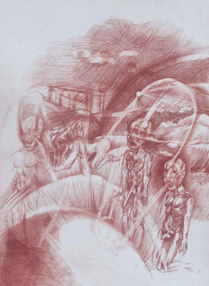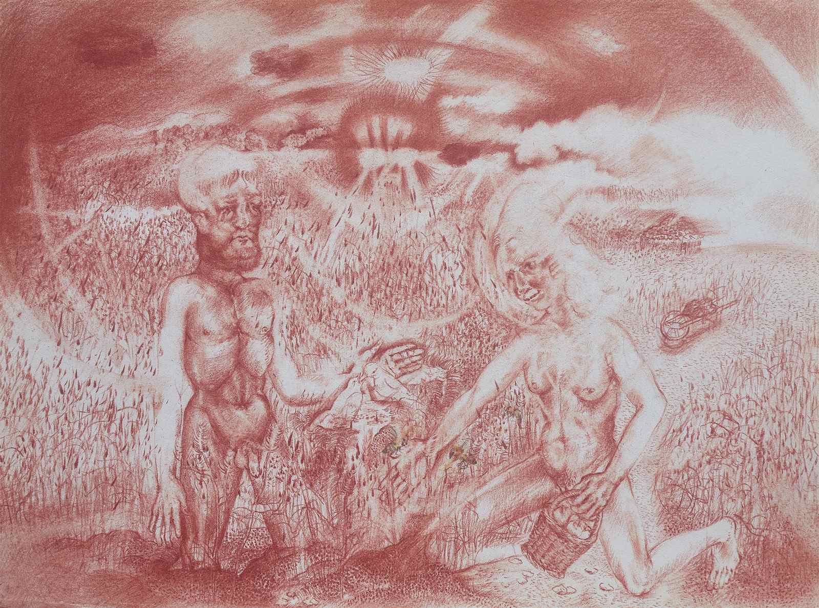 - Anna Mattiuzzo, Ipotesi di civiltà (1), 2023, matita sanguigna su carta, 42×30 cm. Ph. Claudio Buoli