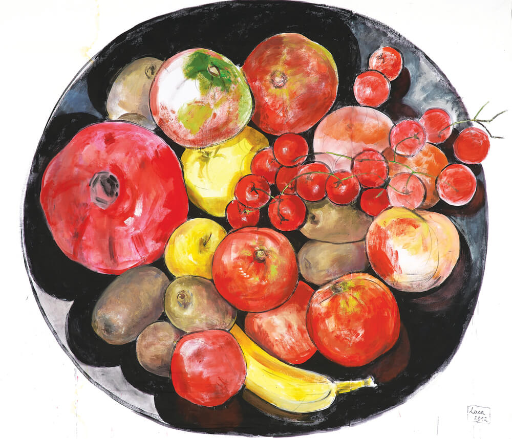 - Frutta e pomodori, 2012. Tempera su lenzuolo, cm 225 x 260