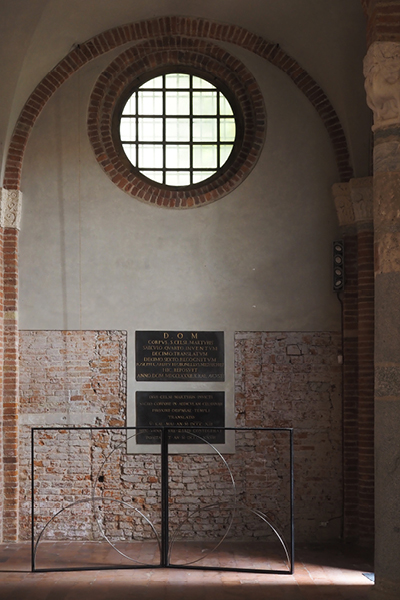 Mario Velocci Scultore presenta una selezione di opere che documentano una parte della prolifica e variegata attività artistica di Mario Velocci, iniziata nei primi anni settanta e che continua tutt’ora. La selezione di opere allestite nello spazio dell’antica basilica e nel giardino si concentrano su sculture e bassorilievi che Velocci ha realizzato in acciaio.