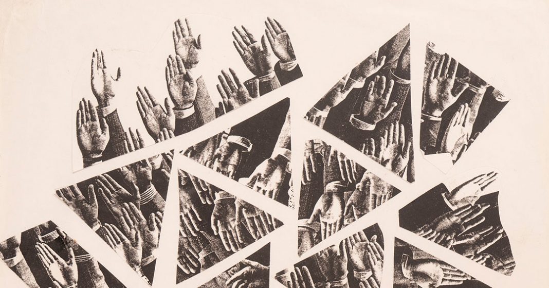 - Paulo Bruscky, Untitled, 1986, collage di fotografie e timbro su carta, 32.5 x 21.7 cm