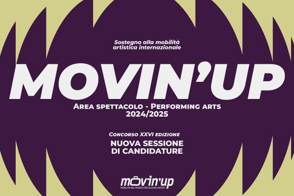 Movin’Up Spettacolo-Performing Arts è un bando rivolto a giovani creativi e creative tra i 18 e i 35 anni di età che operano con obiettivi professionali e che sono stati ammessi o invitati ufficialmente all’estero da enti pubblici o privati, istituzioni culturali, festival, organizzazioni internazionali, istituti di formazione e perfezionamento per esperienze di: residenza e/o produzione, co-produzione, circuitazione/tournée, formazione, promozione e visibilità.