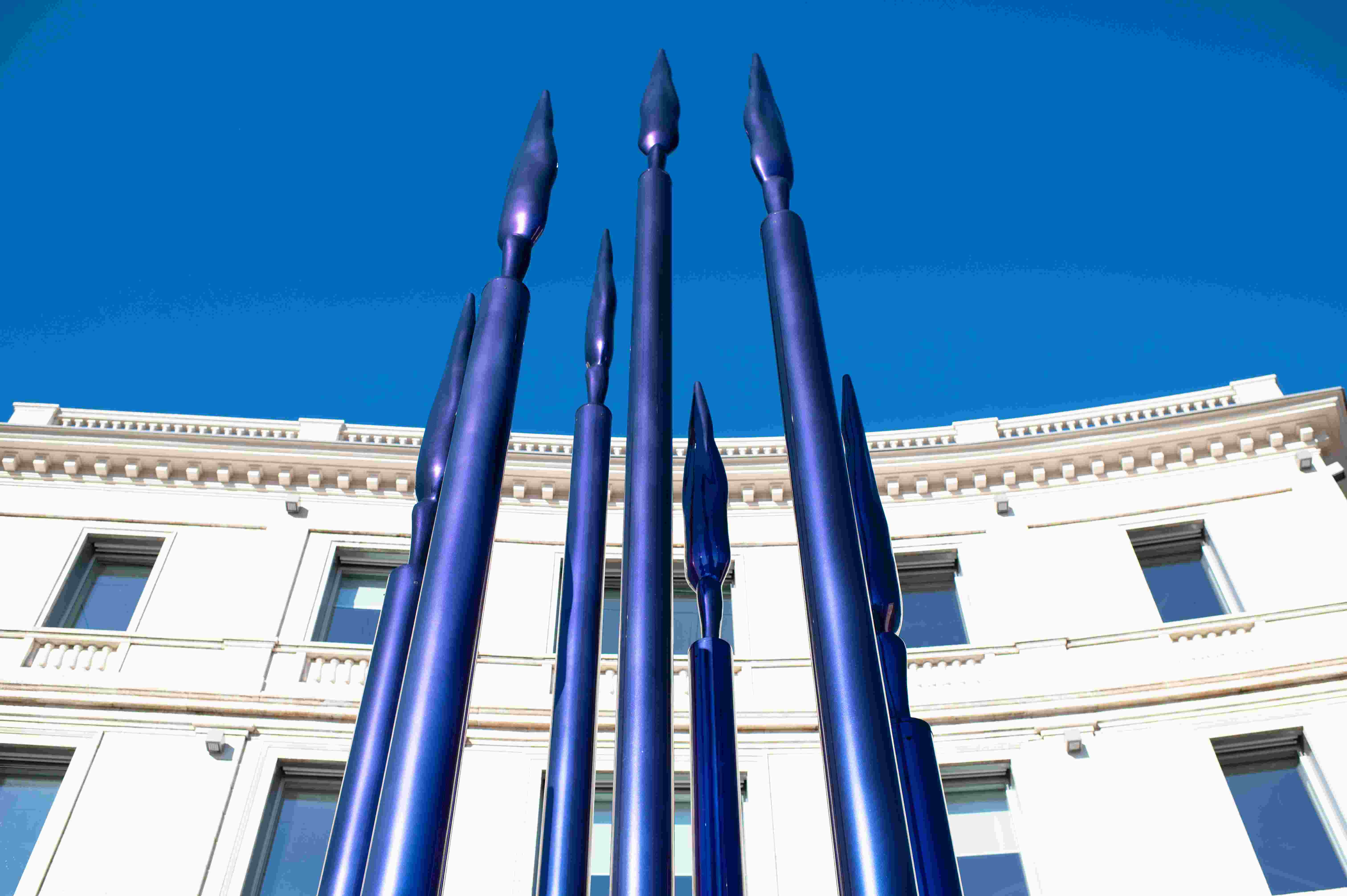 Oliviero Rainaldi è stato chiamato a progettare per Italgas un’opera monumentale concepita come un’installazione diffusa, al fine di riqualificare l’area dove sorgono le sedi della società, in Largo Regio Parco. L’opera, intitolata Flammarion, è composta da un gruppo scultoreo principale articolato in più elementi e da due elementi scultorei singoli. Nella sua collocazione diffusa sul territorio urbano, Flammarion si ispira al concetto delle costellazioni quali insiemi di corpi celesti distribuiti nello spazio con uno schema geometrico riconoscibile, studiate e divulgate a fine Ottocento dall’astronomo Camille Flammarion. Il gruppo scultoreo principale è formato da sette colonne in acciaio sormontate da sette figure umane, realizzate in fusione di alluminio, che si ergono come fiaccole antropomorfe creando il profilo di una fiamma ardente come quella del logo storico dell’azienda. A rafforzare questo concetto è anche la loro colorazione blu cangiante, ottenuta con una verniciatura speciale che cambia continuamente con il mutare della luce, suggerendo il moto perpetuo della fiamma. Le sette colonne, fissate su un basamento a forma di lettera Omega, formano idealmente un cerchio che permette di accogliere ed abbracciare il fruitore, fornendogli un nuovo punto di vista sull’opera. Un’opera monumentale complessa e ricca di rimandi simbolici, che Rainaldi progetta seguendo regole precise per la ripartizione dello spazio e la proporzione fra gli elementi. Un rapporto che si fonda sul numero matematico due e i suoi multipli: due come elemento simbolico che rappresenta la sapienza, la parola divina, il verbo. Un numero capace di cogliere il senso della dualità innato negli elementi: positivo/negativo, materia/antimateria, macro/microcosmo lo stesso dualismo che è presente in una fiamma, che brucia e dunque può distruggere ma anche creare calore