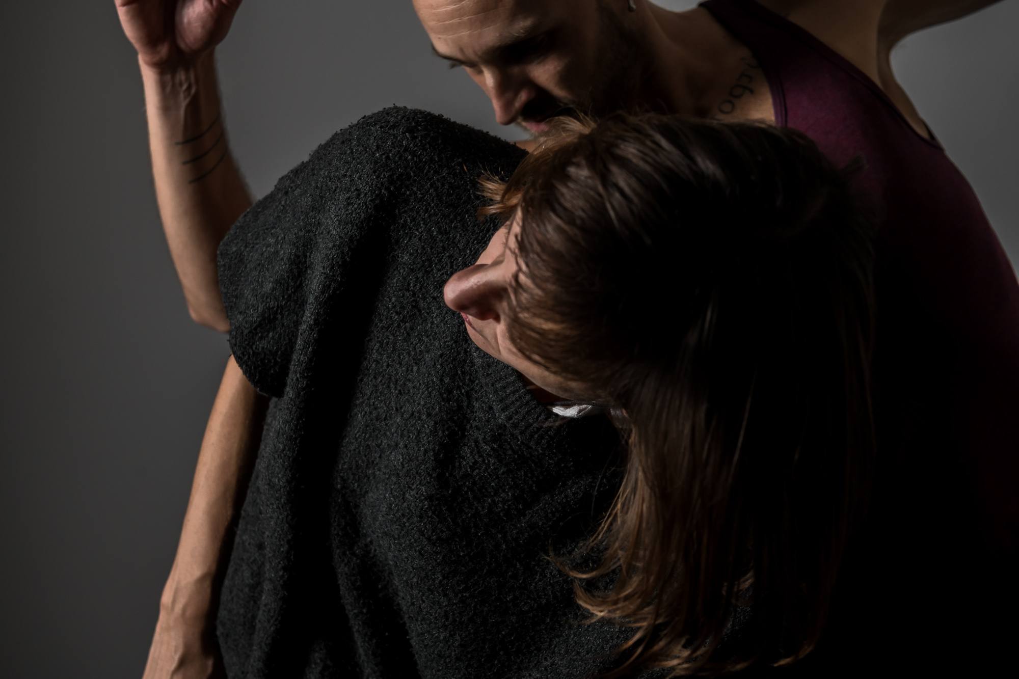 La performance è stata a pensata per gli spazi di artQ13 nel quale i due danzatori/performer e i due fotografi professionisti entrano in relazione tramite gestualità, pause, ripetizioni. I danzatori e la performance vengono documentati dal fotografo Sebastiano Luciano, la cui macchina fotografica è collegata a un computer che trasmette in tempo reale gli scatti, proiettati sulla parete; a sua volta, il fotografo Giorgio Benni riprende e documenta l’intera azione. Come in un gioco di scatole cinesi, l’immagine reale/riprodotta si amplifica e moltiplica, lo sguardo, al contempo, si disperde e cambia traiettoria. Il fotografo è il tramite attraverso cui si attiva un cortocircuito visivo e una sovrapposizione dello sguardo legato al punto di vista: il pubblico può decidere di seguire le azioni dal vivo oppure di osservare le proiezioni sulla parete. Tramite l’ausilio di una Intelligenza Artificiale, input e output si alternano a generare un tracciamento, un plot immaginifico che anticipa la visione, la prefigura, restituendo – fantasmaticamente – lo sguardo stesso del fotografo e al contempo, una sonorizzazione, ideata da Carlo Caloro, fa da contrappunto al ritmato alternarsi dei punti di vista.