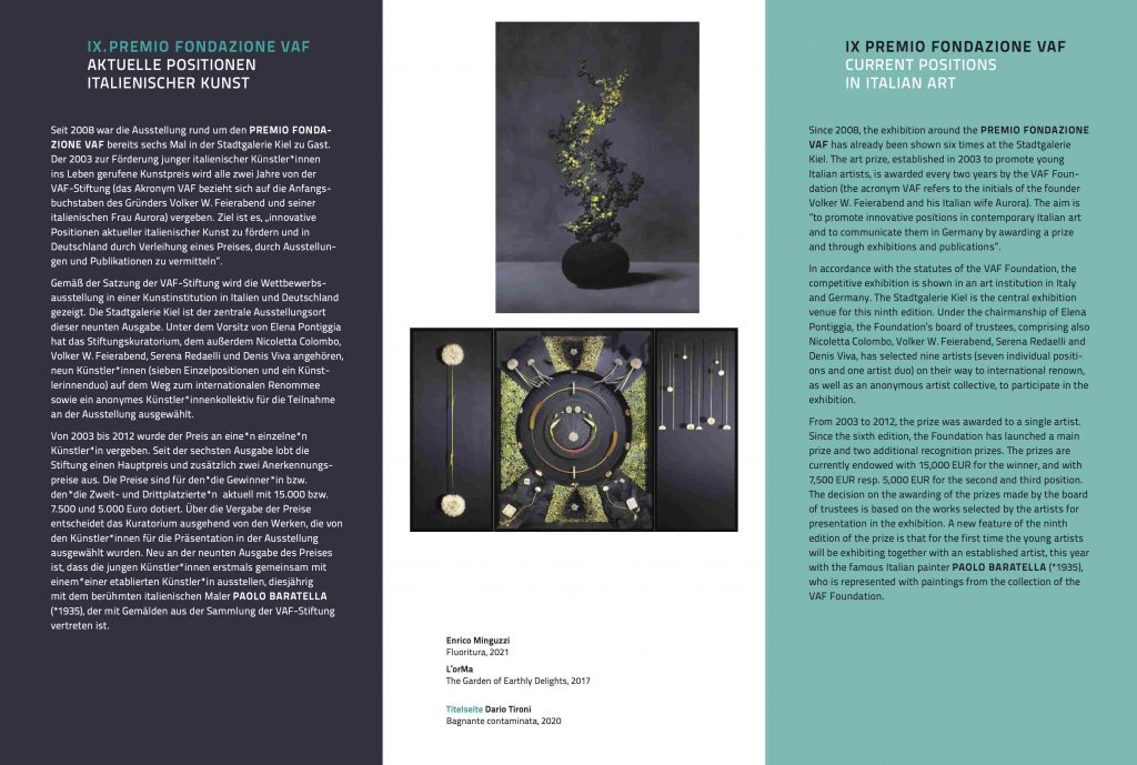 La Fondazione VAF è molto lieta di annunciare che la IX edizione del “Premio Artistico Fondazione VAF” si terrà presso la Stadtgalerie di Kiel dall’11 marzo al 22 maggio 2022. In mostra verranno presentati i lavori dei nove finalisti selezionati dalla Giuria della Fondazione: Luca Azzurro, Renata e Cristina Cosi, Silvia Inselvini, collettivo KEM, L’orMa, Enrico Minguzzi, Sebastiano Raimondo, Dario Tironi, Valeria Vaccaro.