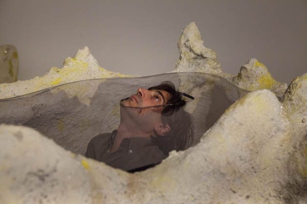 Francesco Cavaliere – Leonardo Pivi, Octatomic Vaso Vasca sotto Vetro – Catarsi solfurea Eidolon, particolare/ detail 2022 sabbie naturali, sabbie ceramizzate, vetri granulati e a specchio, pigmenti, graniglie, ciottoli, policarbonato, 115 × 250 × 350 cm foto/photo © Chiara Pavolucci