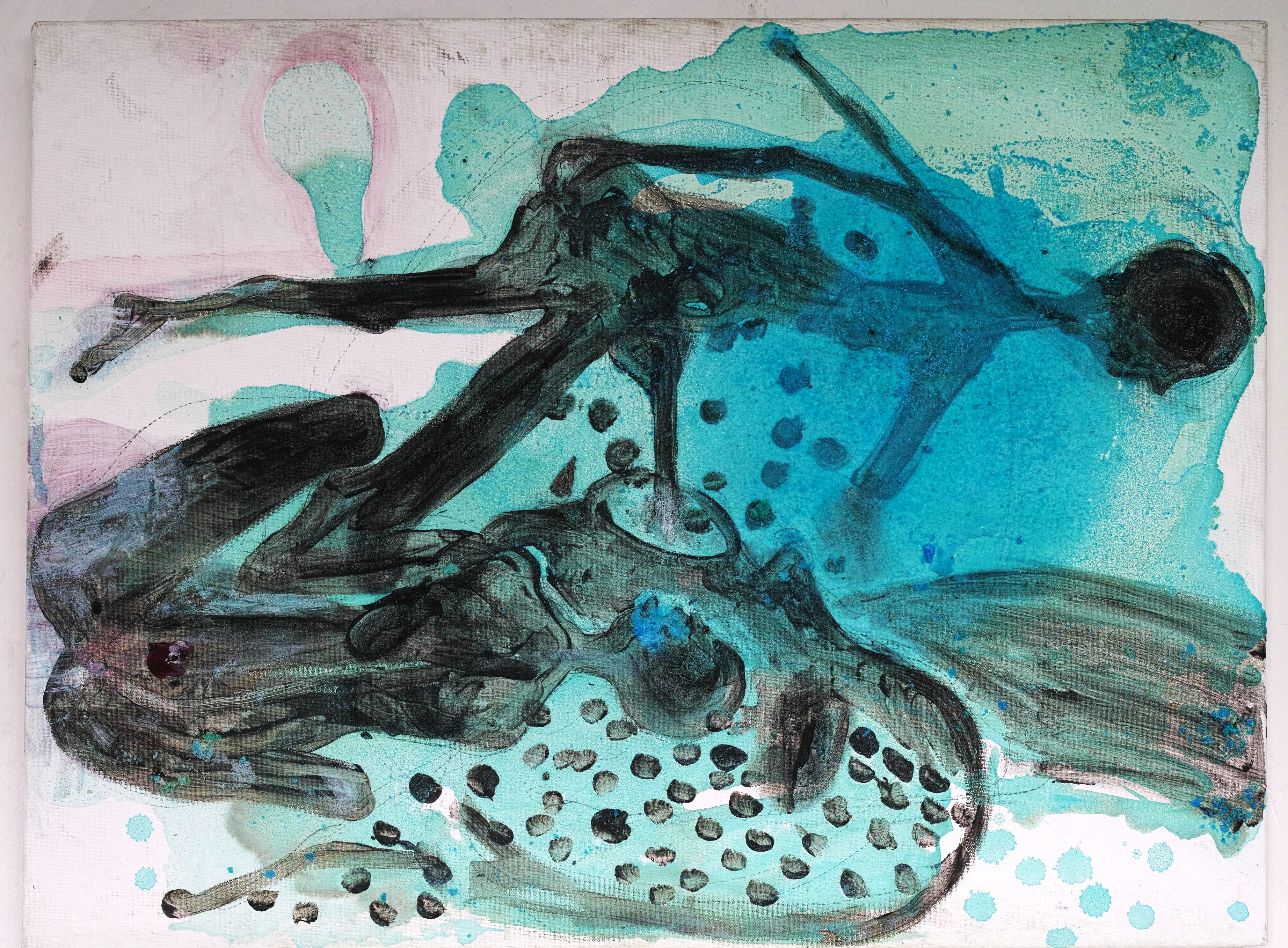 Nei nuovi dipinti di Hiorns, forme umane astratte e vagamente insettoidi si impegnano in atti istintivi che potrebbero essere sesso, oppure un nuovo e ambiguo tipo di movimento. Qua e là, le superfici delle tele di Hiorns sono corrotte da polipi carnosi di lattice, o annullate da fioriture cristalline di solfato di rame blu, una sostanza che suggerisce una crescita autoriale, inorganica e divorante.