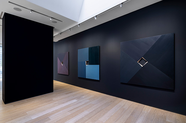A contraddistinguere tutte le opere in mostra è il foro centrale, fulcro visivo che con la sua presenza-assenza diventa il vero e proprio filo conduttore dell’esposizione. Questo buco squadrato, la cui visibilità è accentuata dai bordi bisellati lasciati volutamente intonsi, diventa il focus su cui siamo invitati a concentrarci, prima di poter estendere lo sguardo all’opera nella sua interezza, al contesto immersivo di cui è parte integrante e infine oltrepassare il dipinto, indagare lo spazio reale senza alcuna limitazione ed estendere il proprio raggio assaporando un assaggio di infinito.