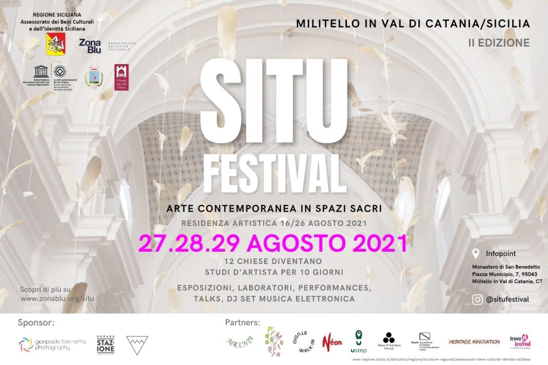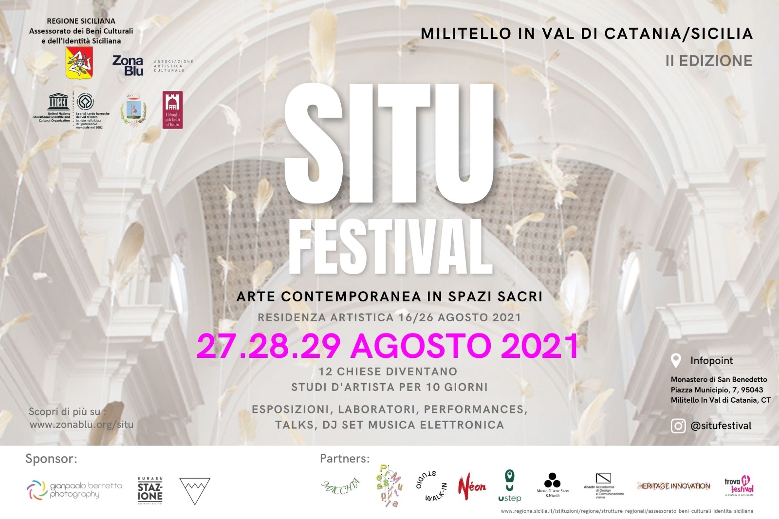 SITU Festival è un progetto d’arte contemporanea all’interno di spazi sacri fondato nell’Agosto del 2020 dall’artista Nicola Tineo, co-founder dell’A.p.s. Zona Blu, organizzatrice della II edizione che si terrà dal 16 al 29 Agosto 2021 a Militello in Val di Catania (Sicilia).